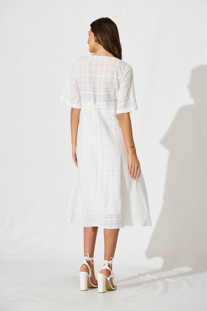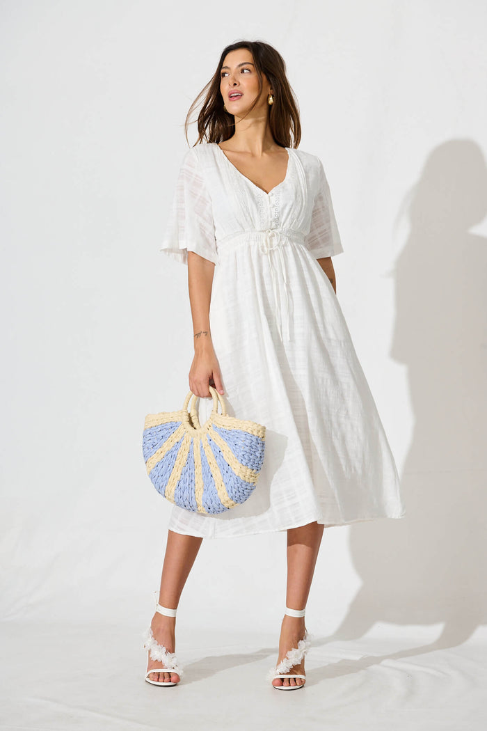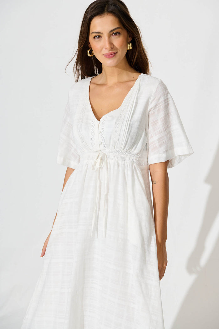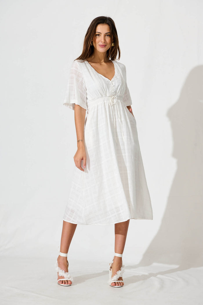 Sass up your summer wardrobe with our Kersey Midi Dress! It features a flattering v neckline and short flutter sleeves for an ultra-feminine look. The functional buttons down the front add a touch of sophistication, while the functional drawstring waist details complete its modern charm. An A-line skirt design gives it a timeless silhouette that's sure to make you stand out from the crowd!