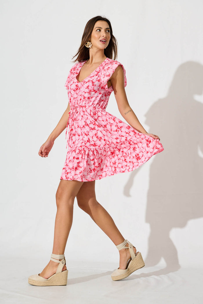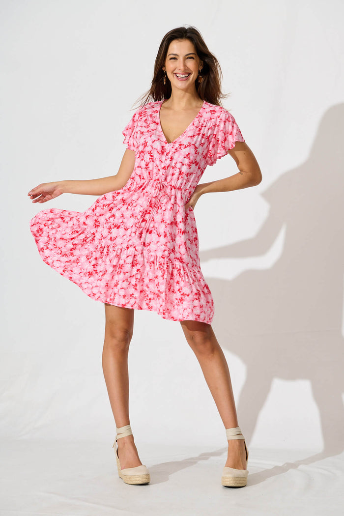 Comfort meets fun with our Kimbra Smock Dress. It features a relaxed fit with a button down front & a free-flowing skirt with ruffle detail. Style this boho inspired piece with, white strappy sandal and basket bag to match.