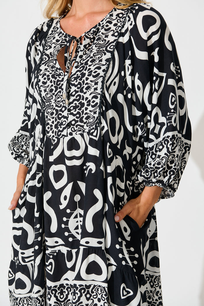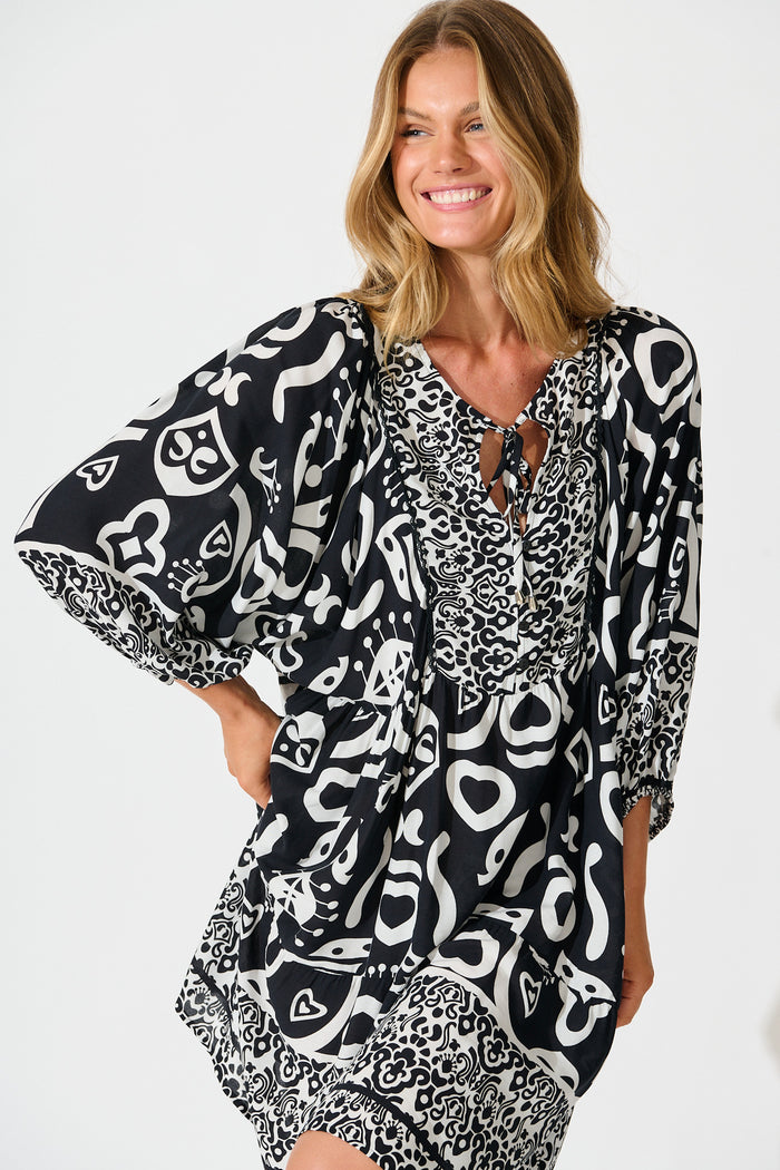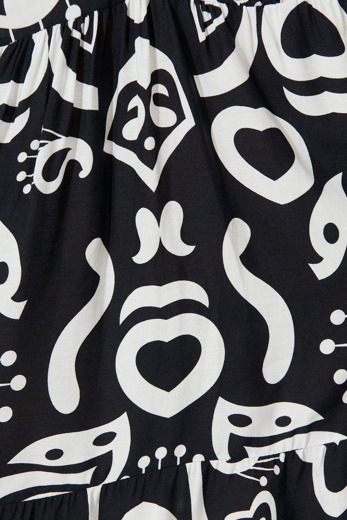 Kira Smock Dress in Black with White Border Print