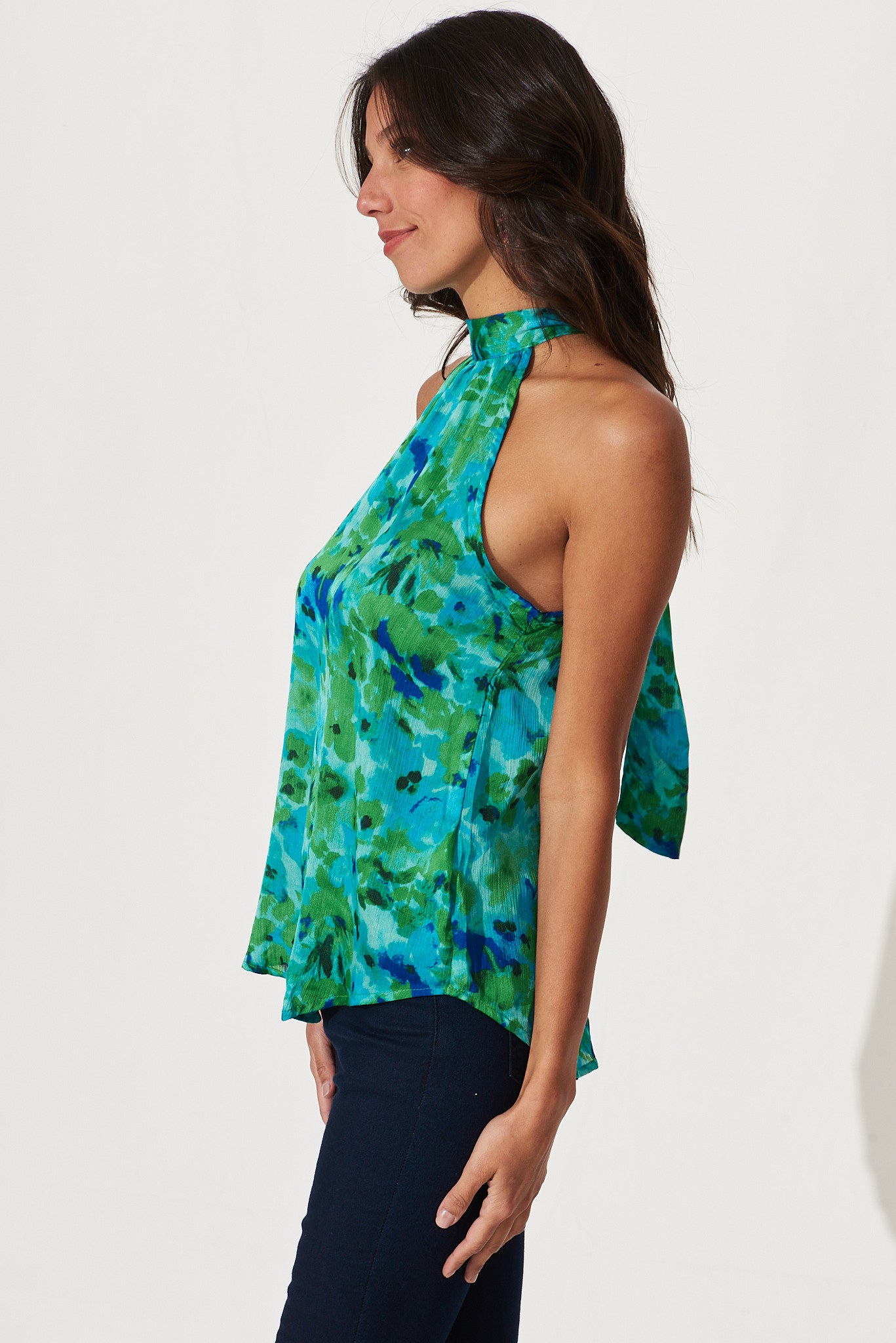 Kiss Kiss Halter Neck Top In Green Watercolour Print Satin