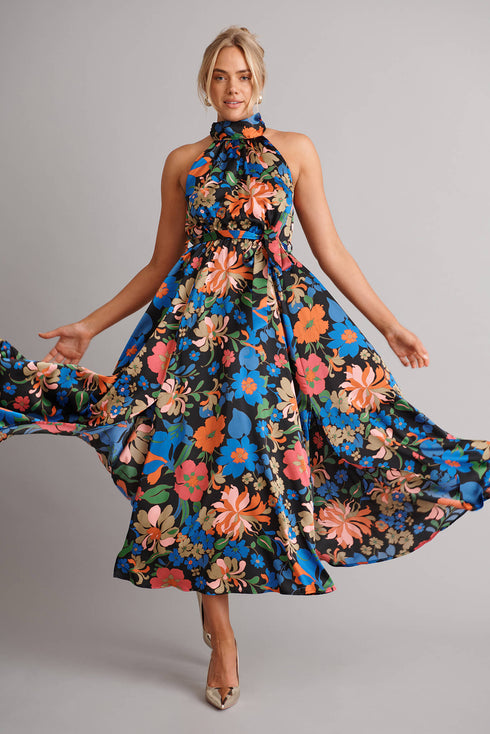 Kiss Me Halter Neck Maxi Dress in Black Floral Satin