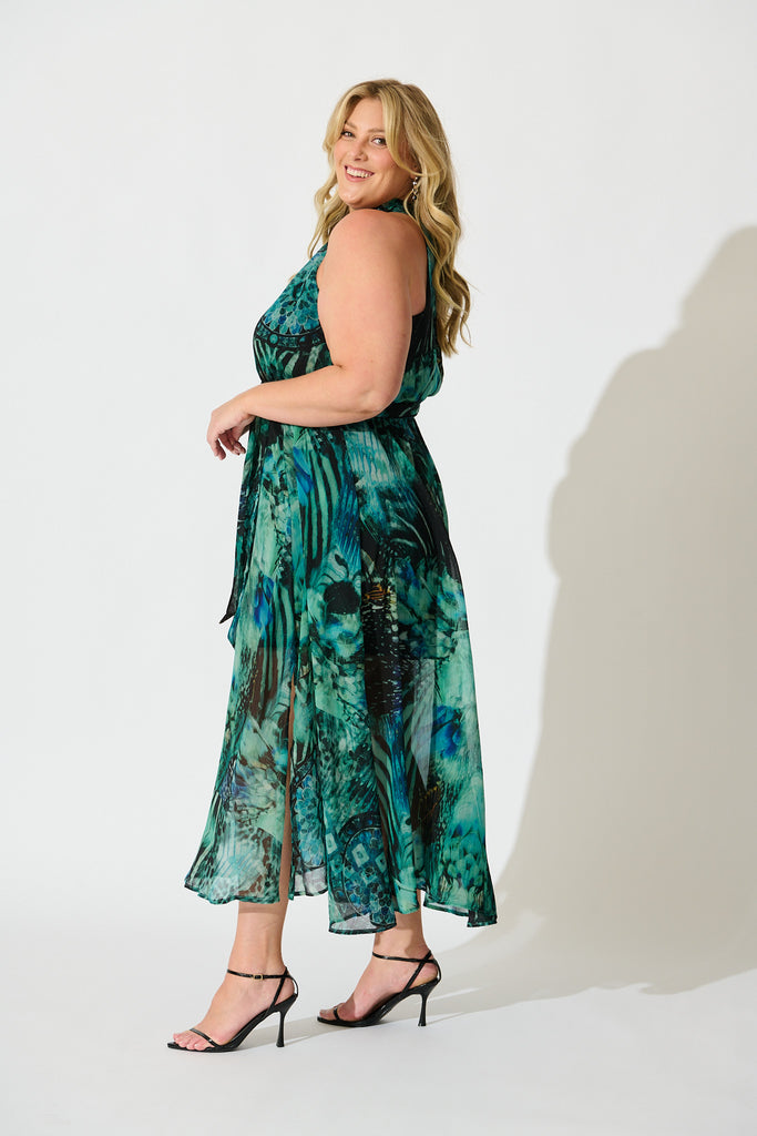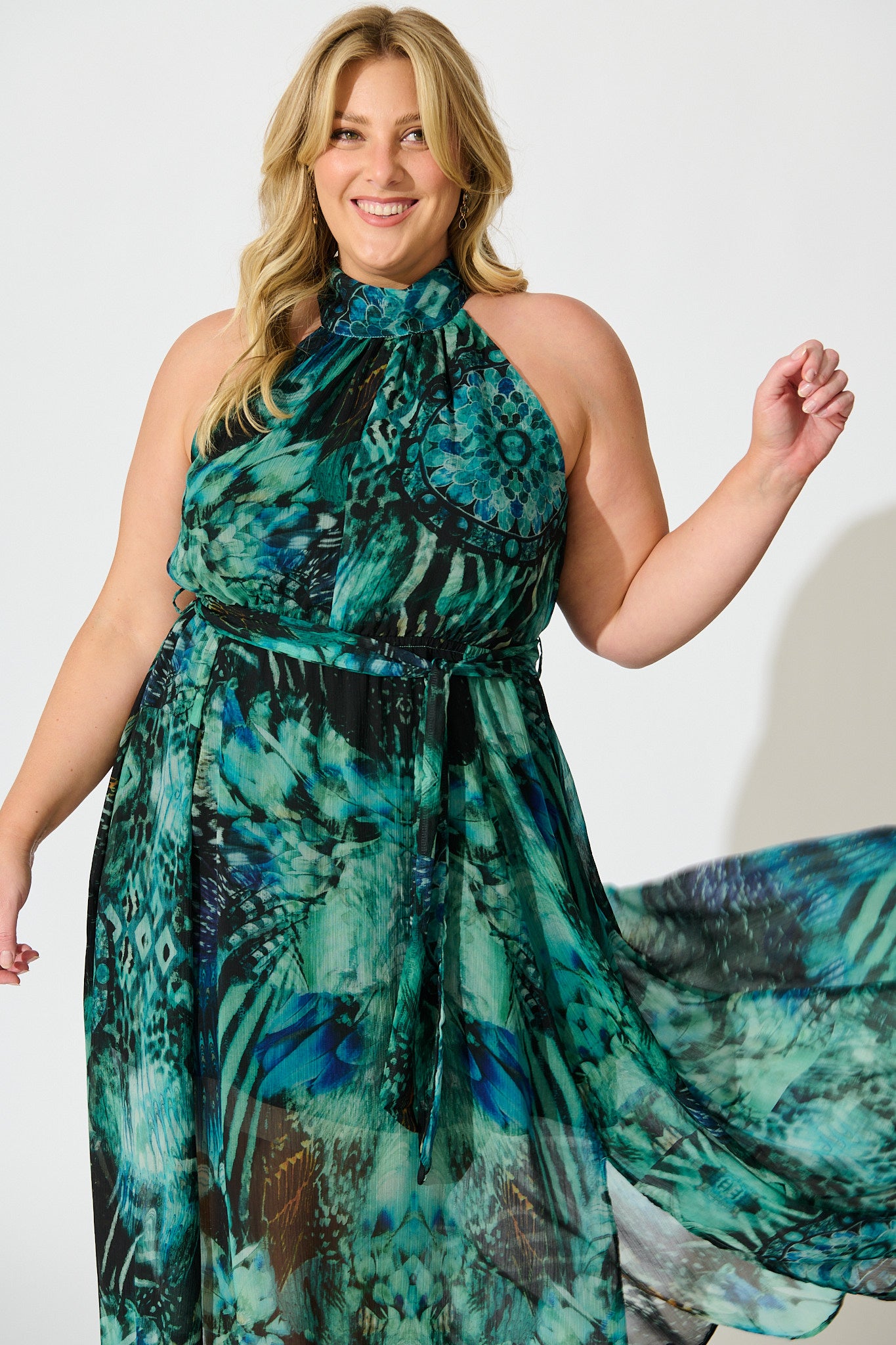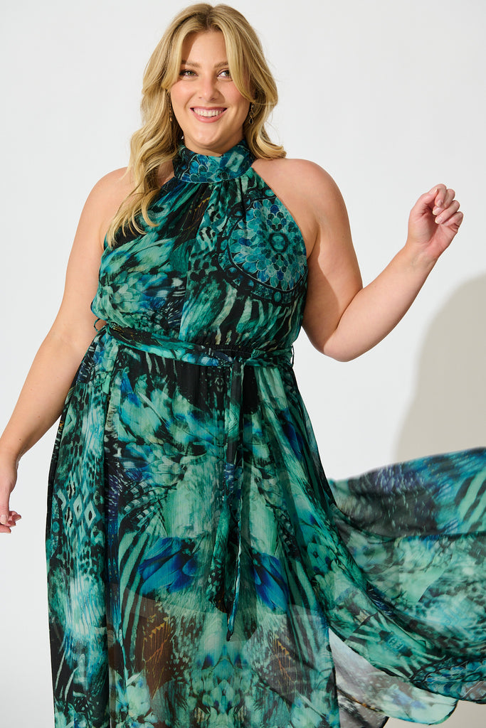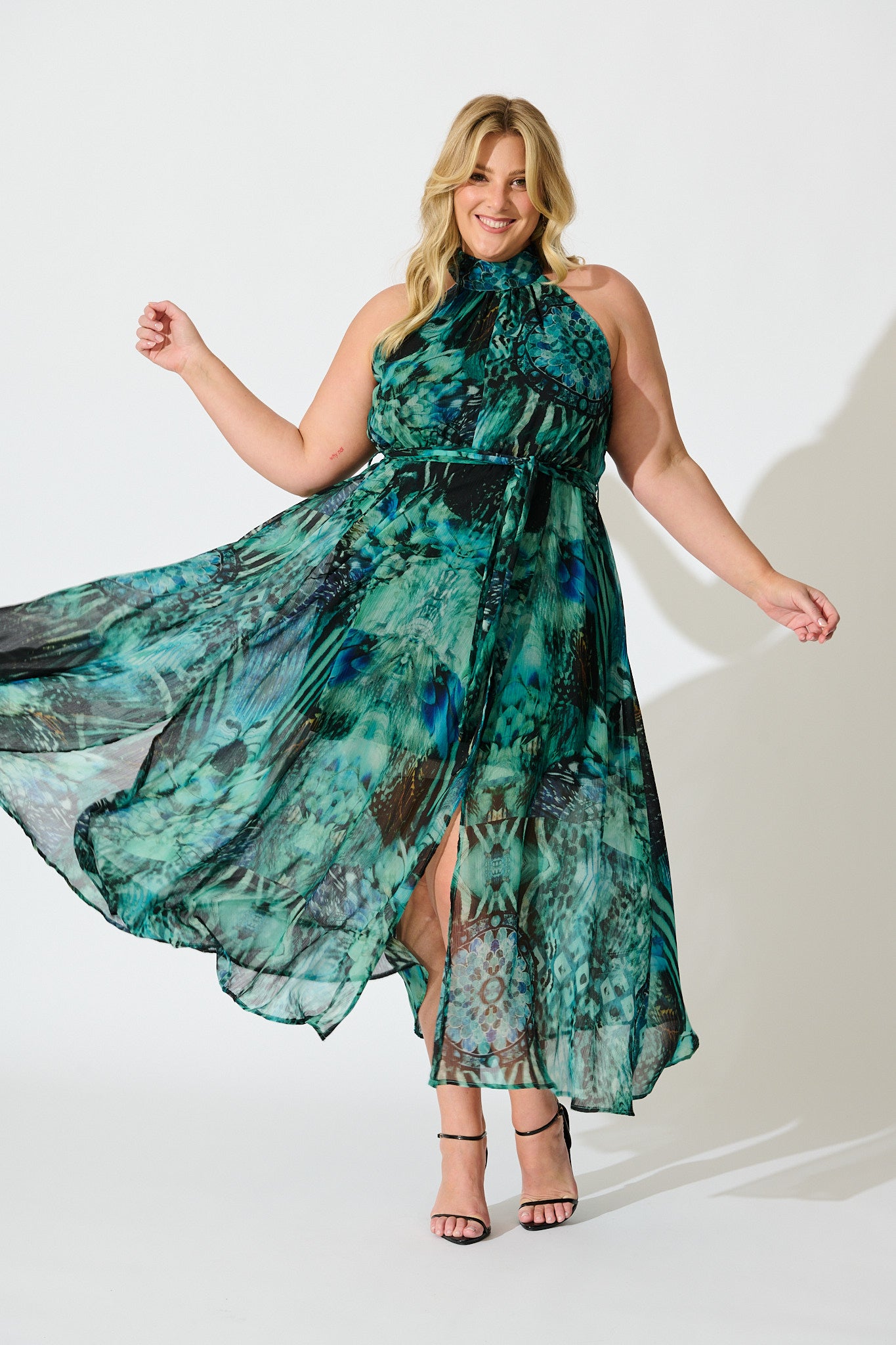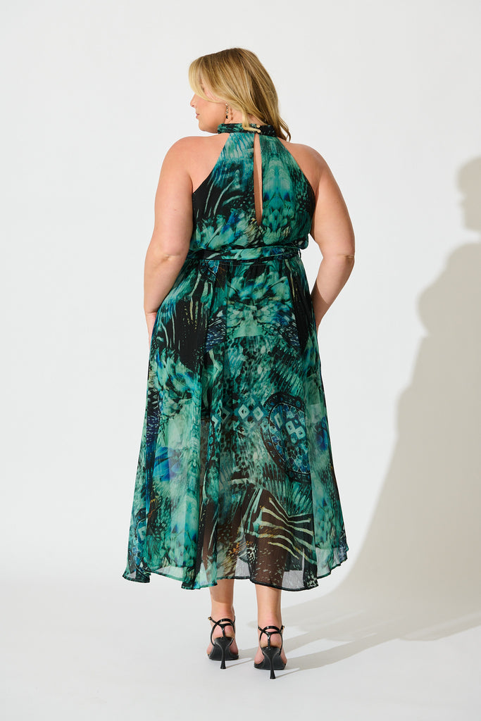Kiss Me Halter Neck Maxi Dress in Green Multi Chiffon