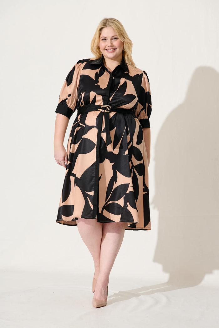 Kristel Shirt Dress In Brown With Black Print Satin