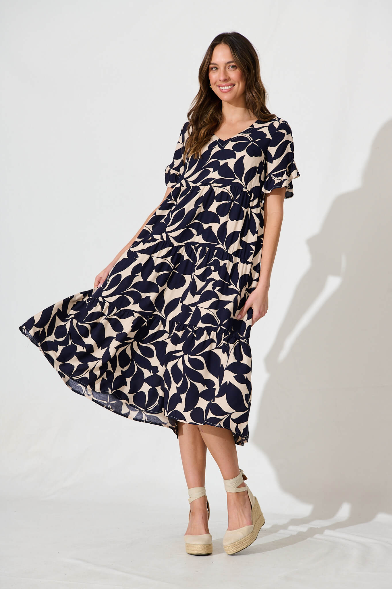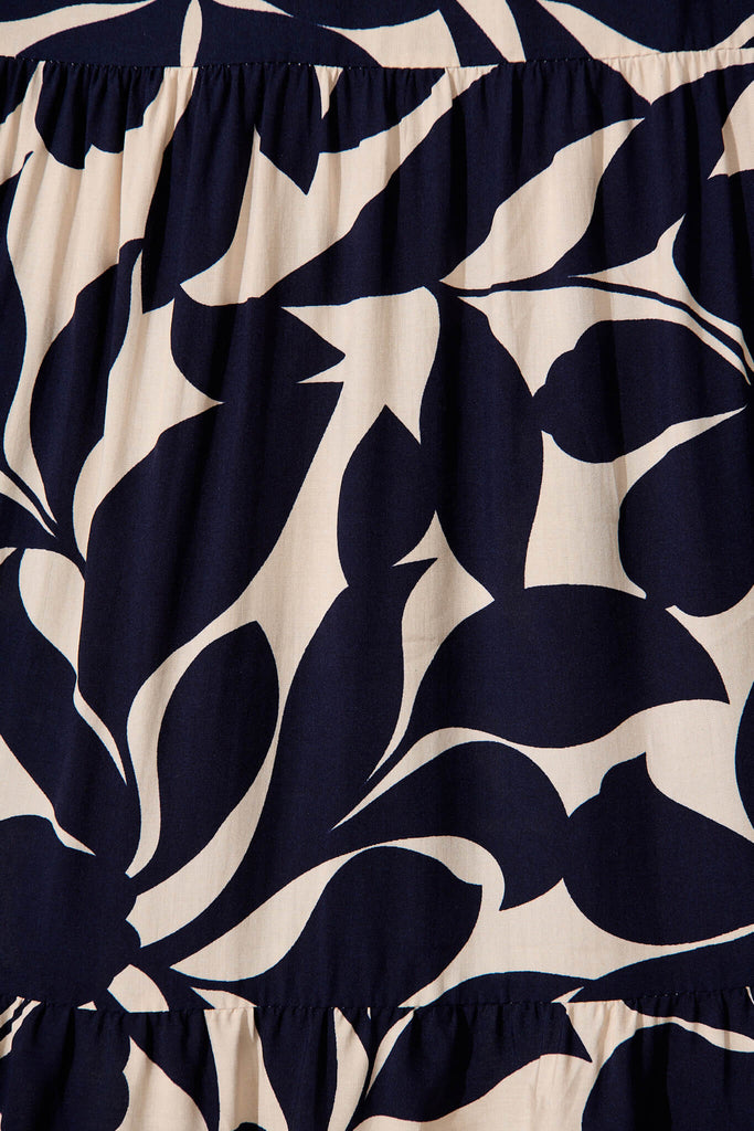 Kristen Midi Smock Dress In Beige With Navy Floral