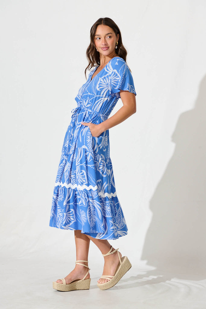 Laconia Midi Dress In Blue Print with Ric Rac Trim