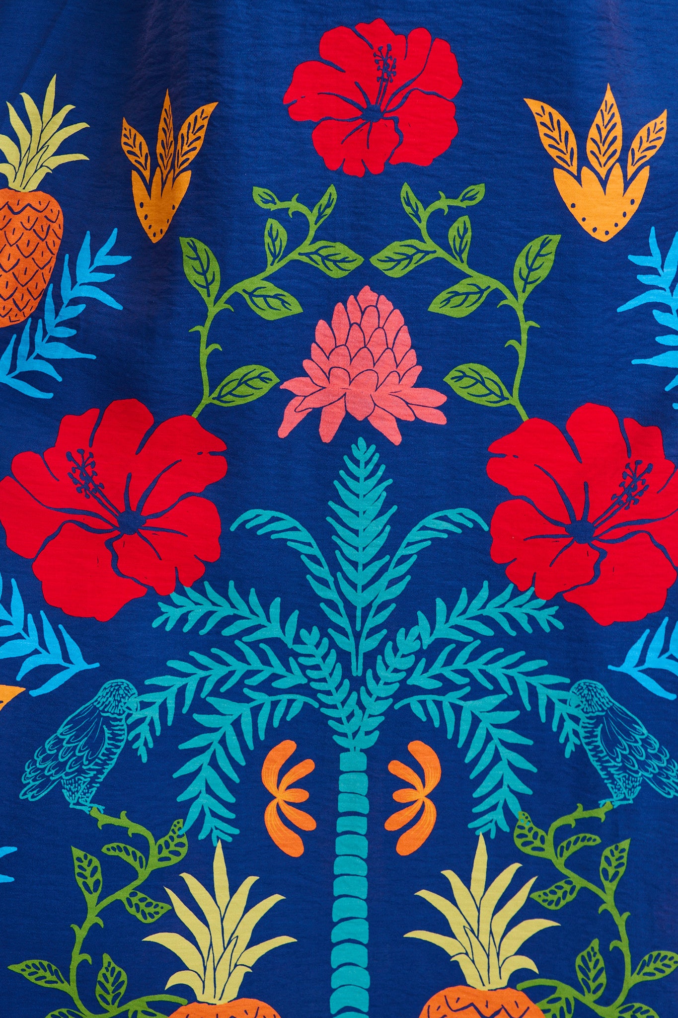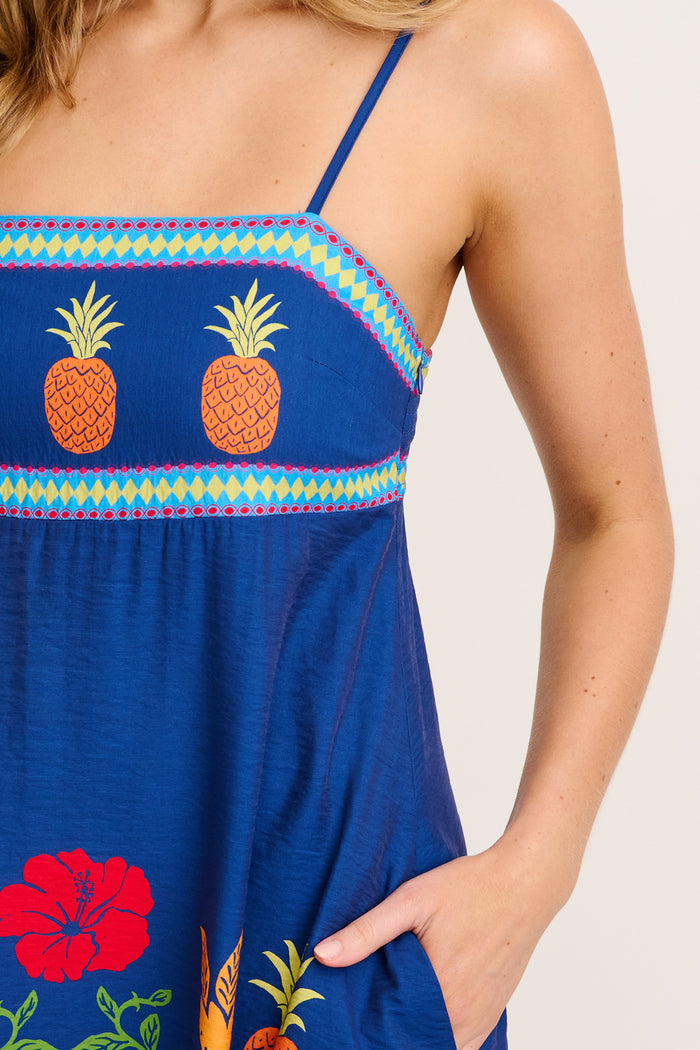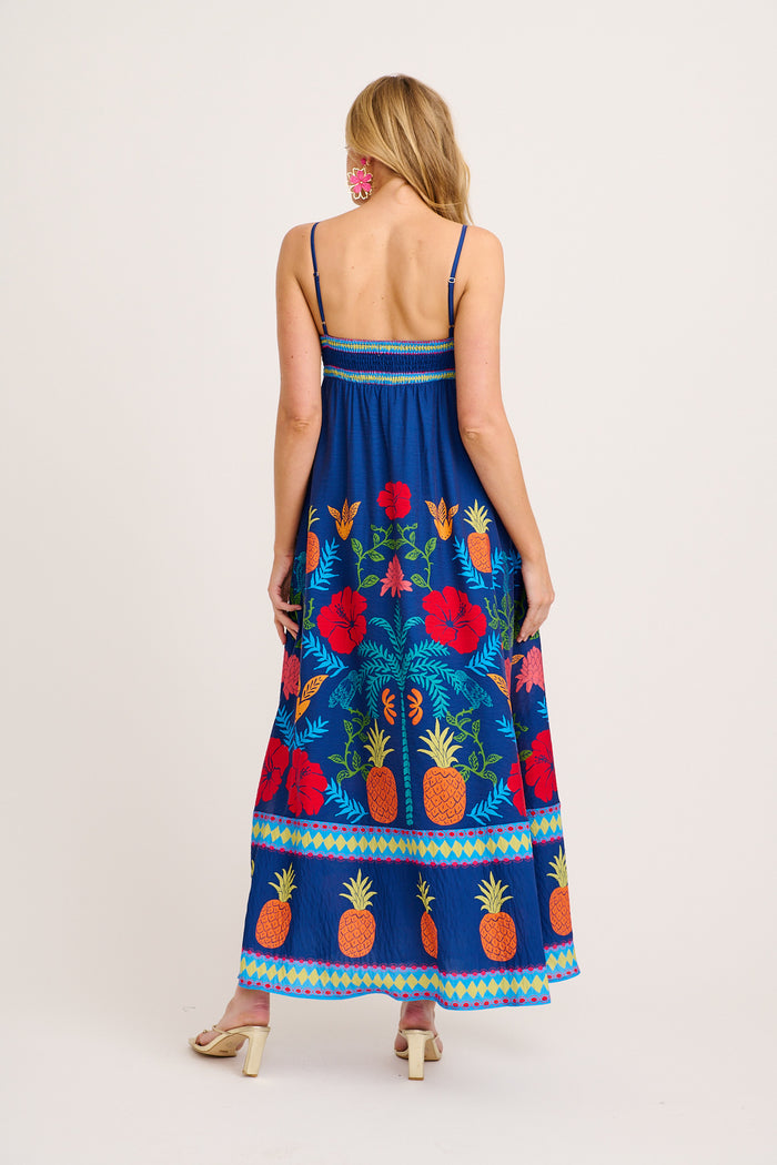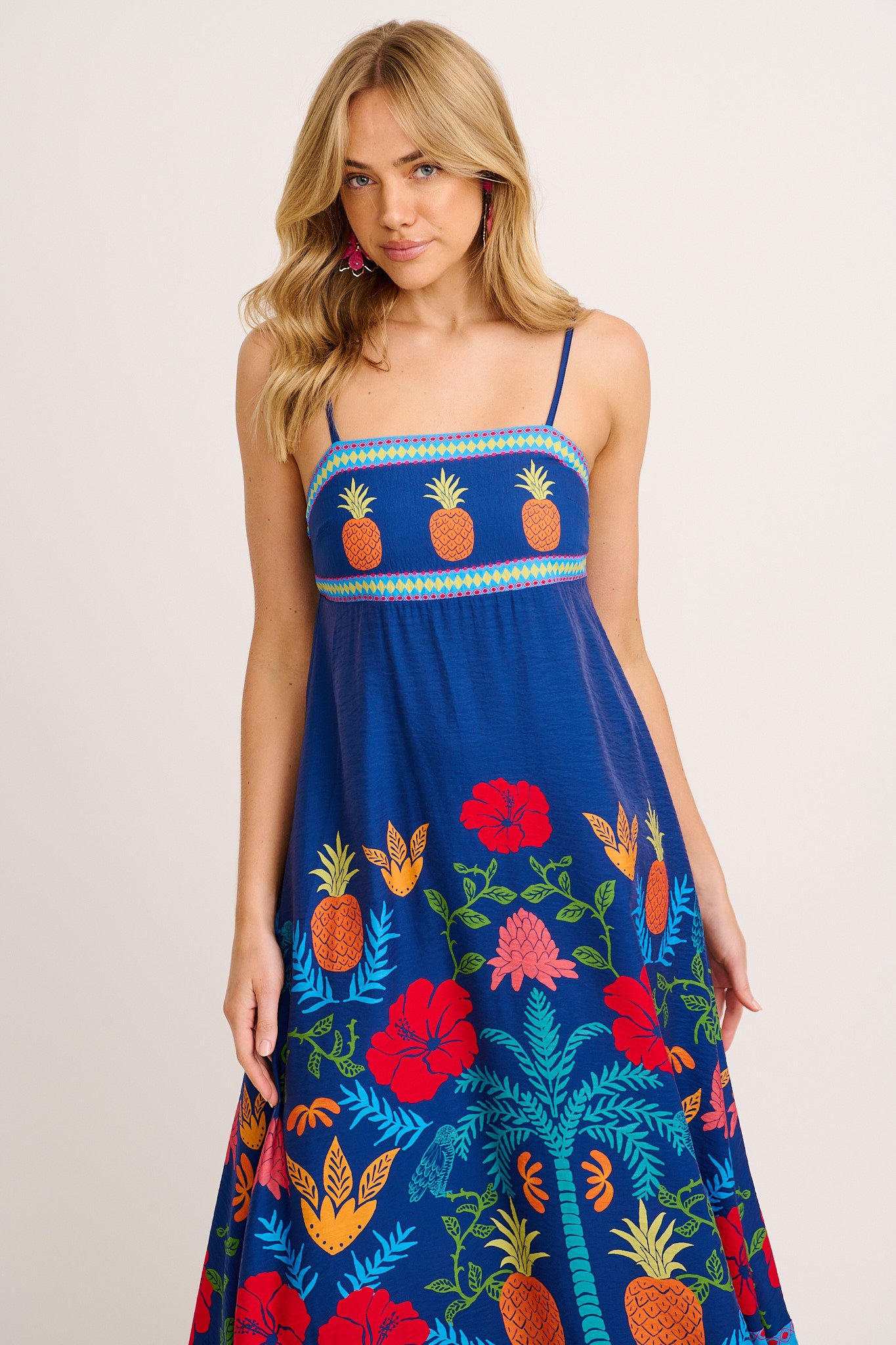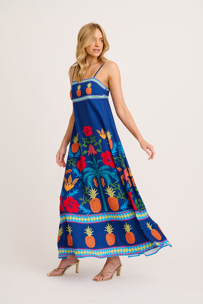 Lavara Maxi Sundress in Navy Multi Tropical Linen Blend