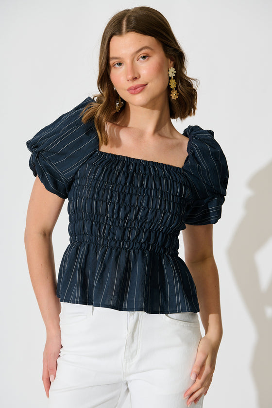 Layne Shirred Top in Navy with White Stripe
