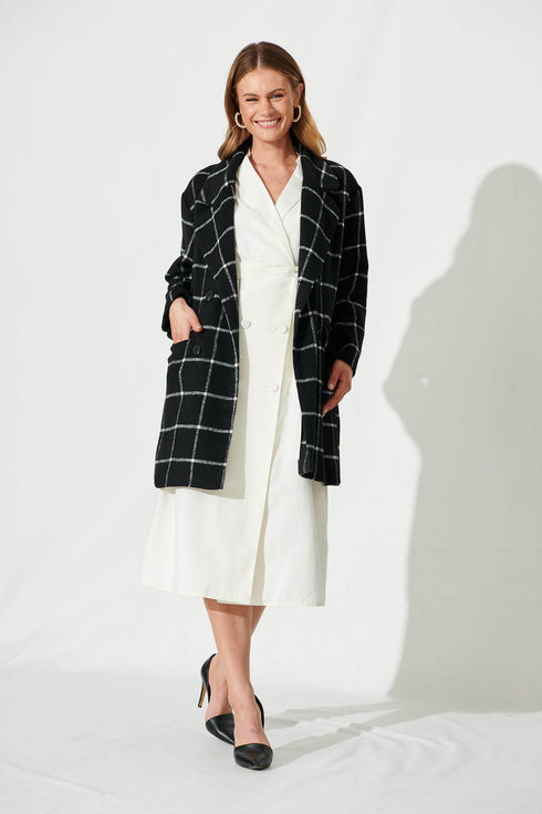 Add a contemporary flare to your trans seasonal wardrobe with our Lennox Coat patterned monochromatic check squares. It features notched lapels, double breasted button detail and functional front pockets. Style it over a fine ribbed knit and favourite pair of jeans.