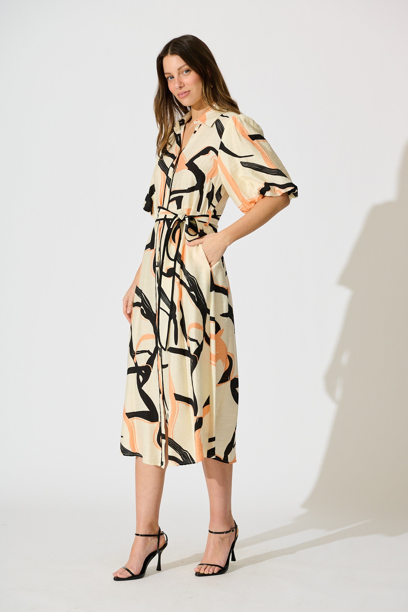 The Libra Midi Shirt Dress in Cream with Orange Print blends relaxed tailoring with warm tones. This dress delivers laid-back polish, complete with soft structure and breathability.