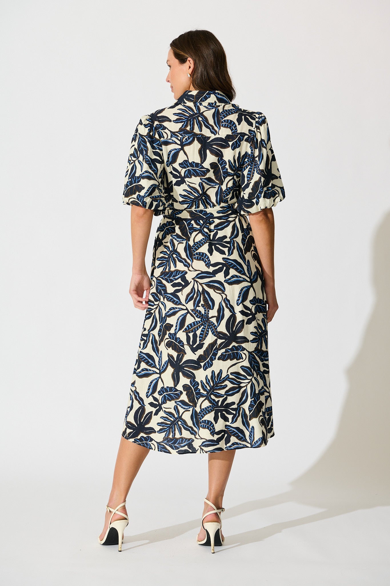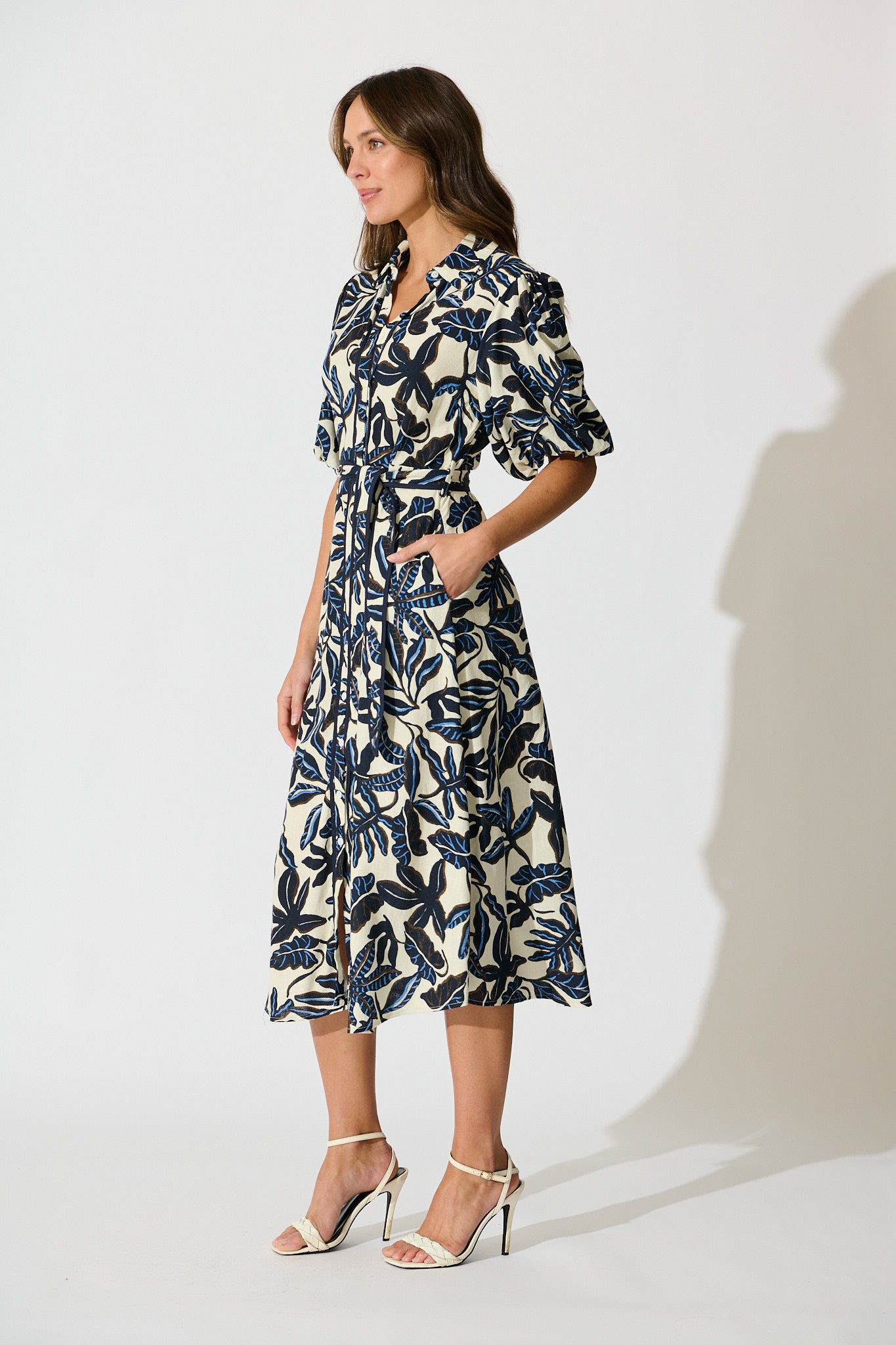 PRE ORDER Libra Midi Shirt Dress in Navy and Cream Leaf Linen Blend