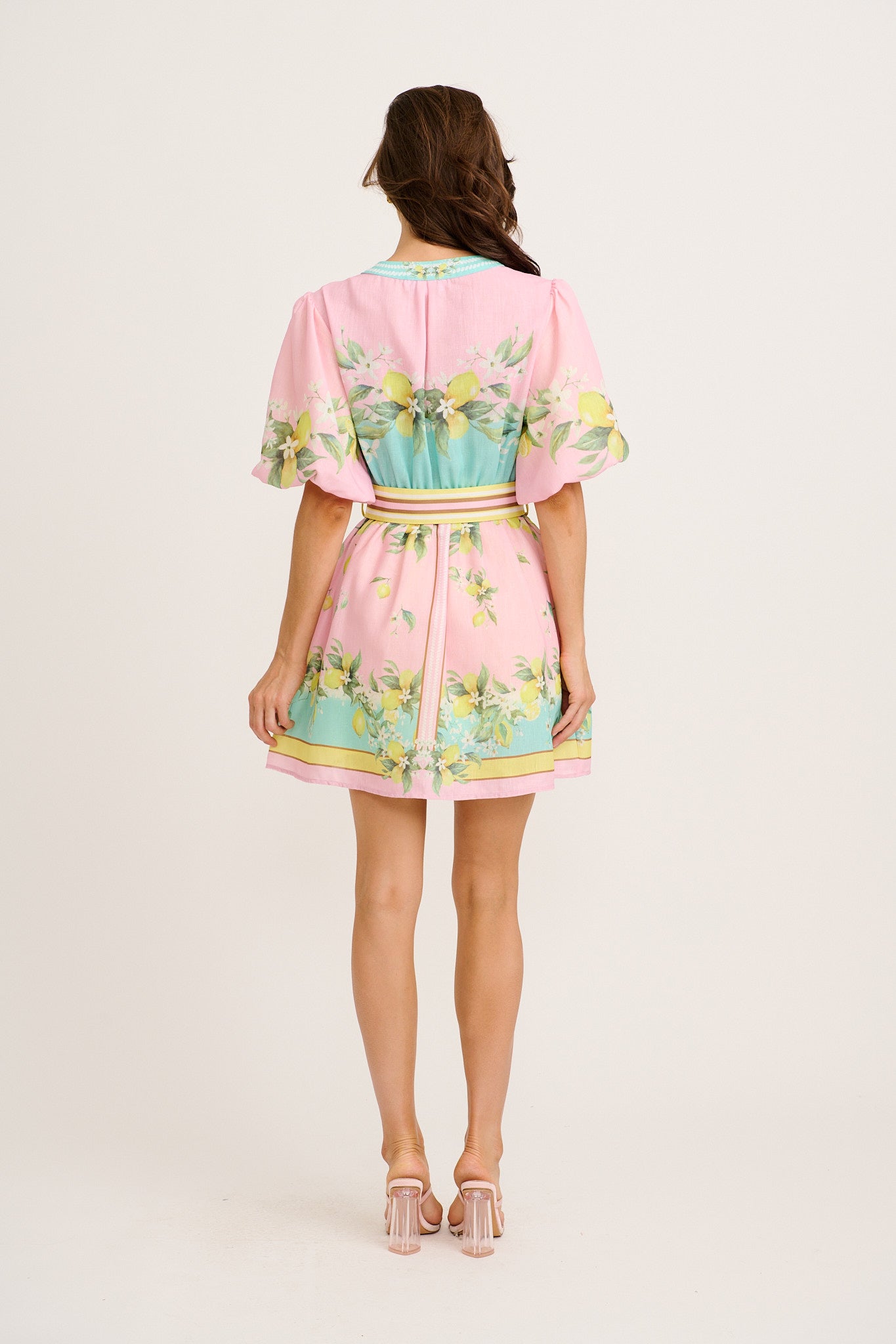The Limonelle Dress in Pink with Lemon Linen Blend combines vintage charm with warm-weather ease. Its breathable fabric, puff sleeves and lemon print make it perfect for sun-filled celebrations and weekend catch-ups.