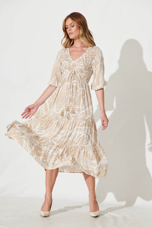 Linda Midi Dress In Taupe With White Leaf Print