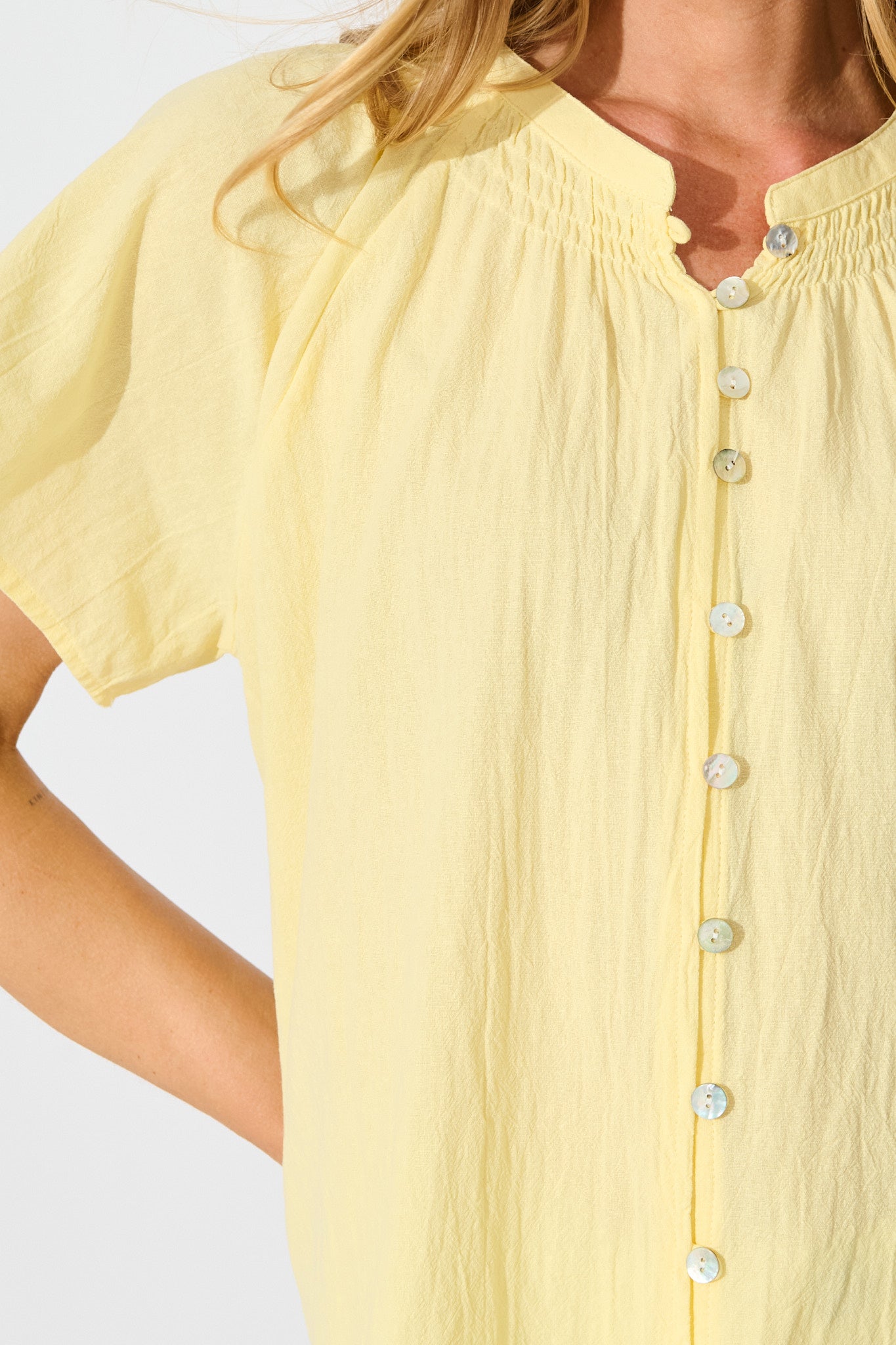 Designed in a lightweight cotton-linen blend, the Lombard feels as cool as it looks. The mandarin collar and functional button front add a refined finish, while the raglan sleeves and shell button detailing keep it relaxed and contemporary. A shirred neckline gives it that soft, feminine touch and makes it perfect for layering or styling solo.