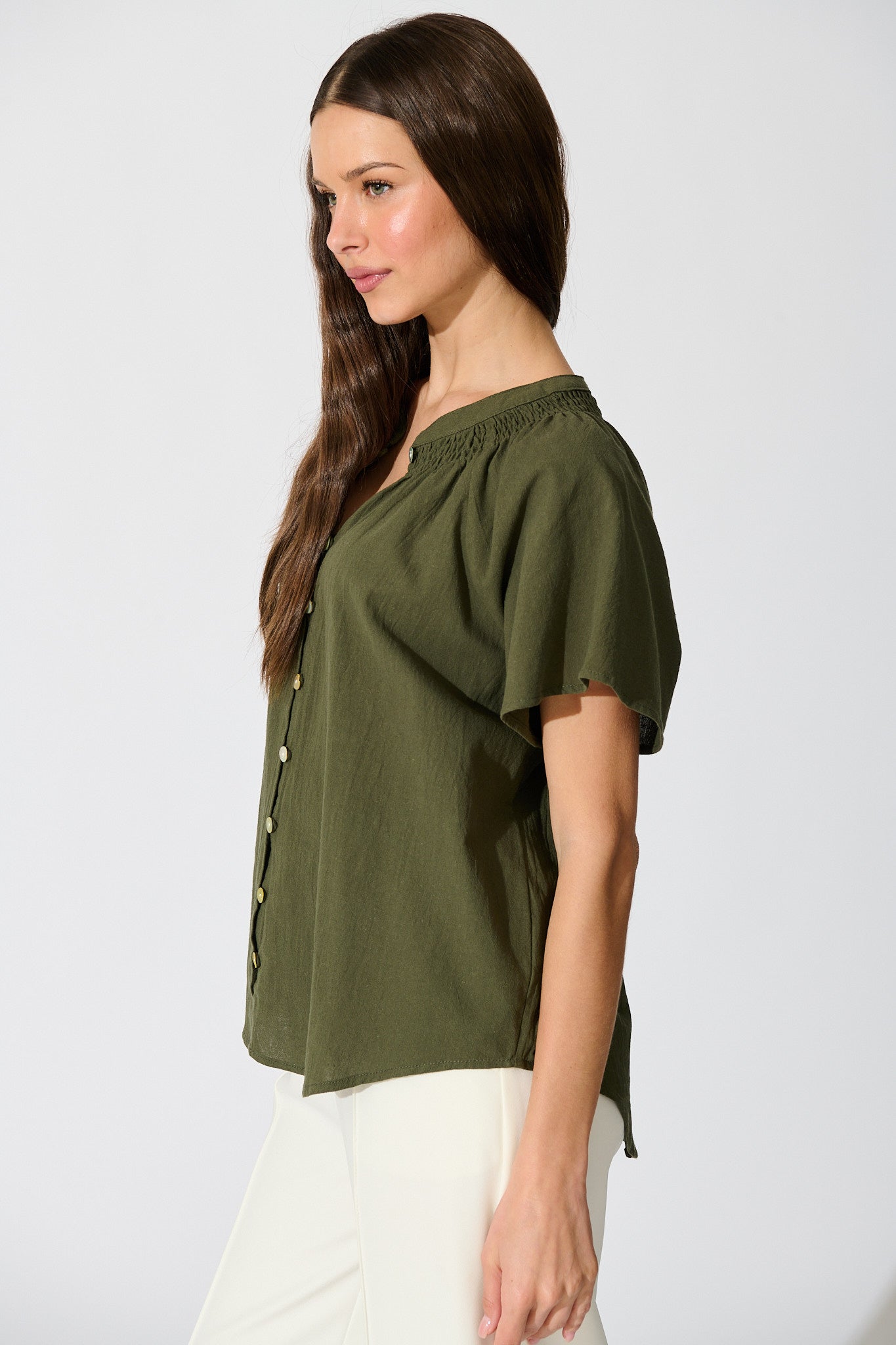Designed with everyday ease in mind, the functional button front makes this style a smart choice for breastfeeding mums or anyone who appreciates easy styling options. The rich khaki hue works effortlessly with denim, white, black or neutrals, making it an easy go-to across the seasons.