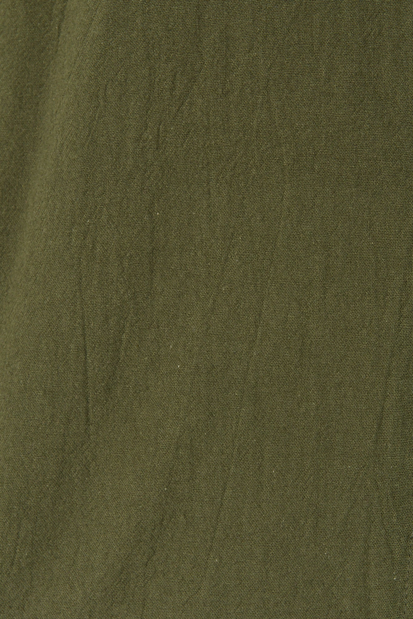 Crafted from a breathable, lightweight cotton-linen blend, this top has a beautifully soft hand feel with that natural texture we love. The non-stretch fabric falls gently over the body, offering a relaxed silhouette with subtle shape thanks to the shirred neckline and curved hi-lo hem. A mandarin collar and shell buttons with self-loops complete the look with artisanal finesse.