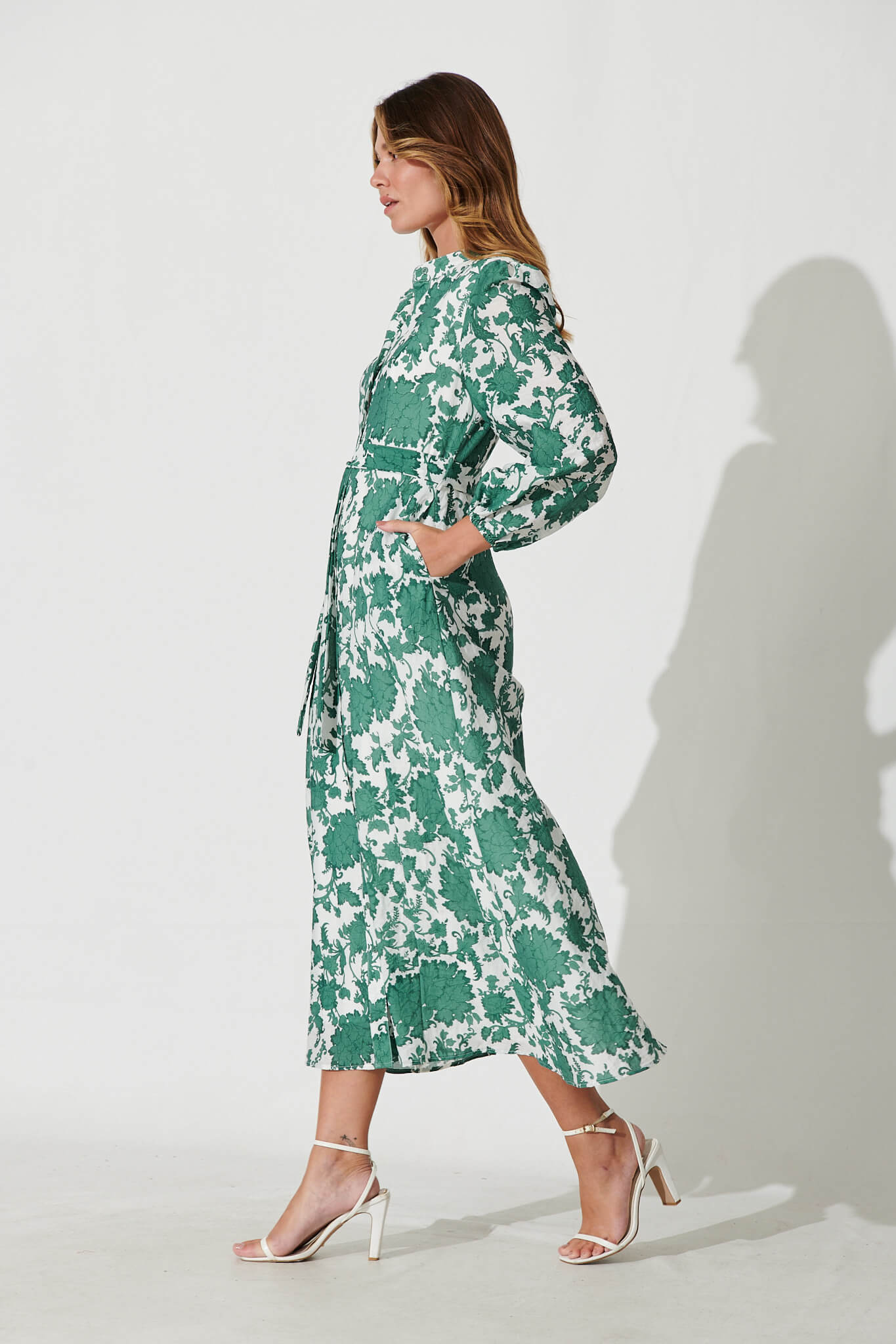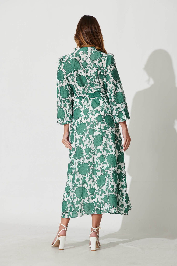 Lorie Maxi Shirt Dress In Emerald With White Floral Cotton Blend