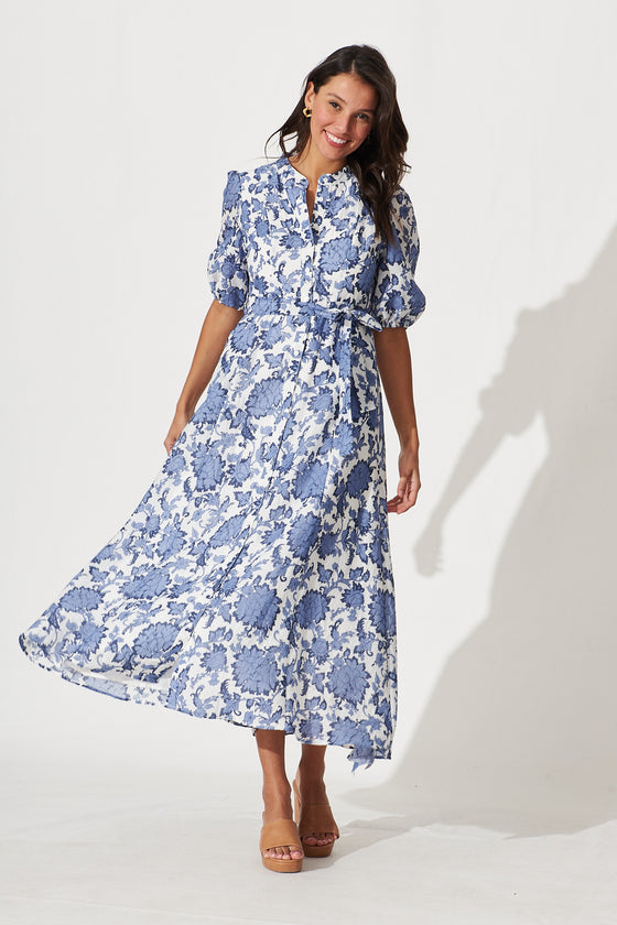 Loriet Maxi Shirt Dress In Blue With White Floral Cotton Blend