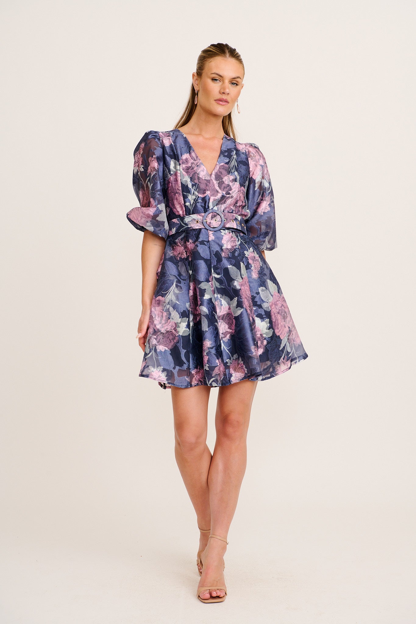 The textured organza overlay creates dimension, while the fully lined interior ensures comfortable wear. A V neckline and princess cut bodice enhance the feminine shape, complemented by encased elasticised puff sleeves and a separate waist tie for definition.