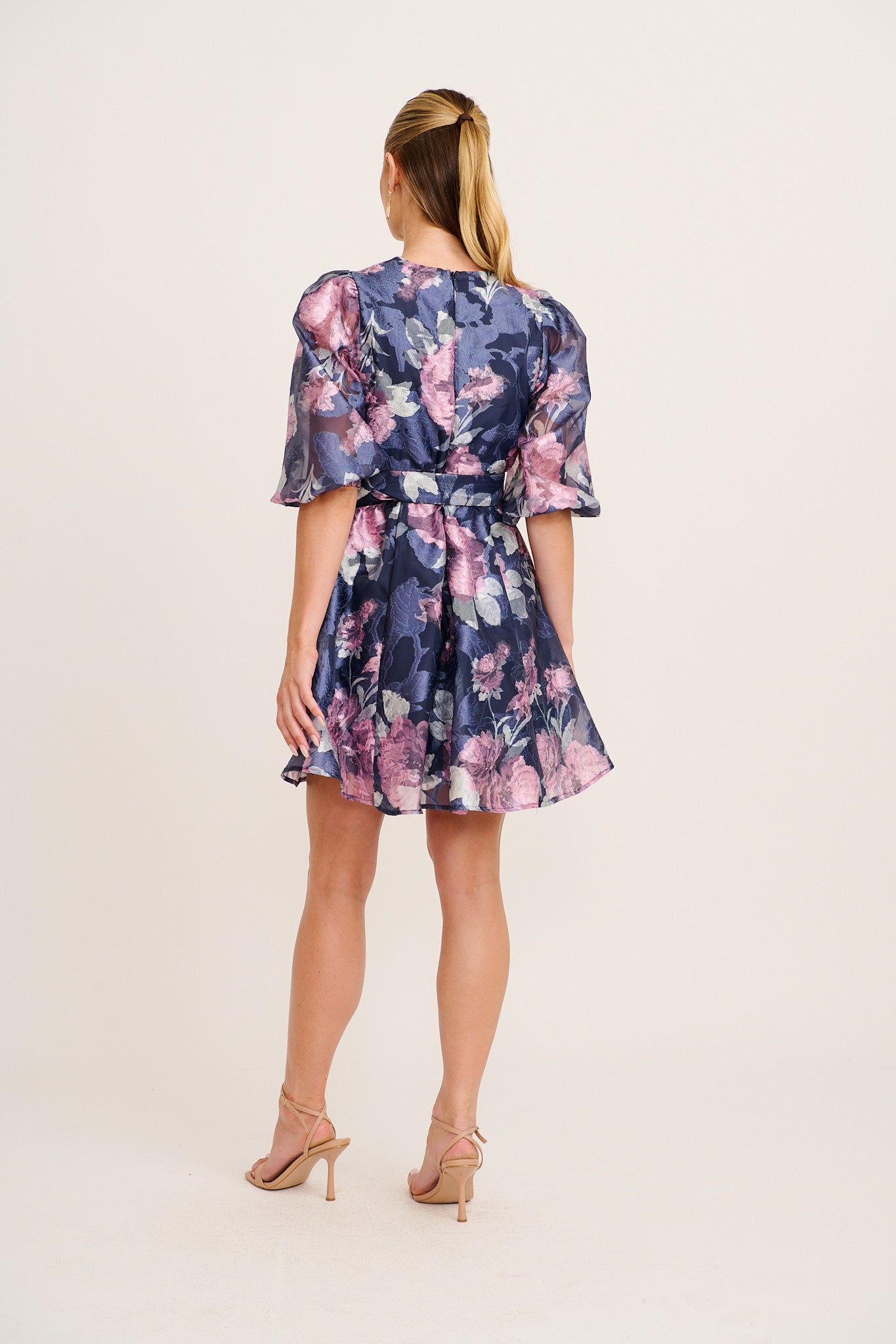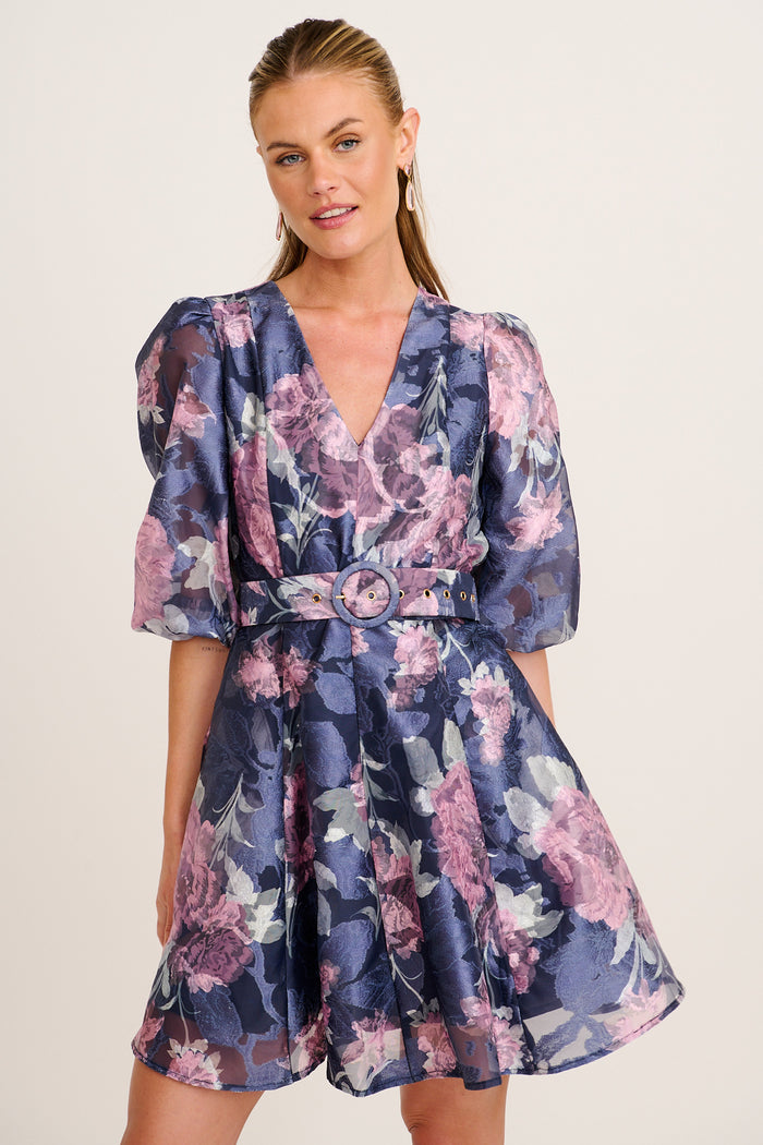 The Love Emotions Dress in Navy with Pink Floral Organza brings refined romance to your special occasion wardrobe. Designed in a flattering fit and flare silhouette, this statement piece balances structure and softness beautifully.
