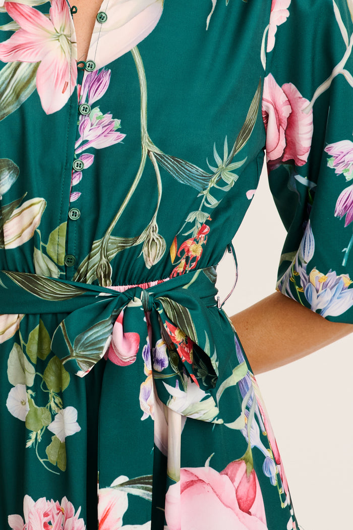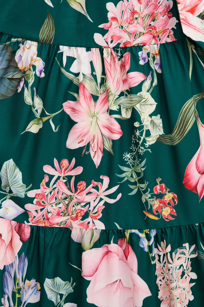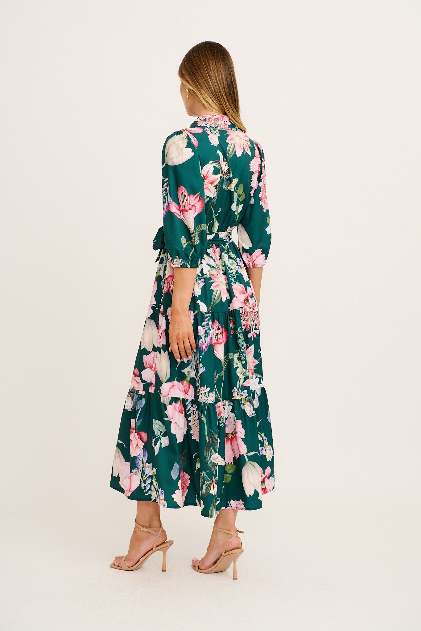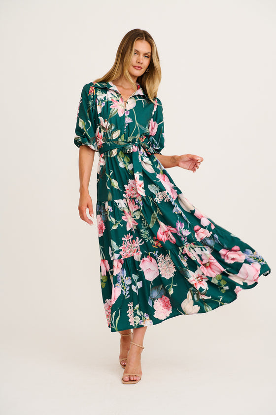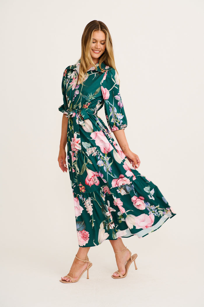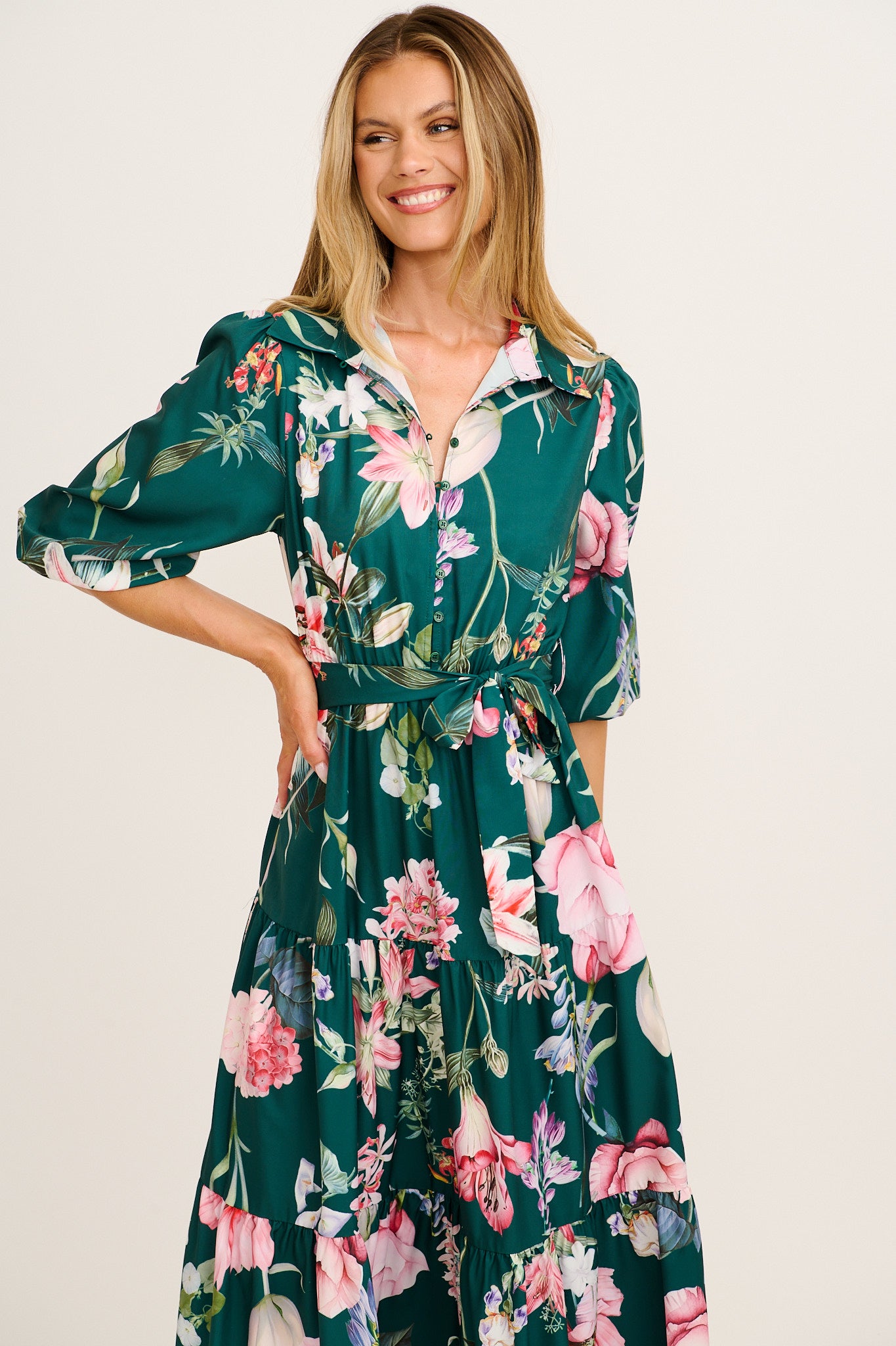 The Love Song Maxi Dress in Green with Blush Floral is where romance meets everyday versatility. With its soft floral print, tiered skirt, and shirt dress silhouette, it offers comfort and polish in equal measure — ideal for office days, weekend brunches, or casual parties.