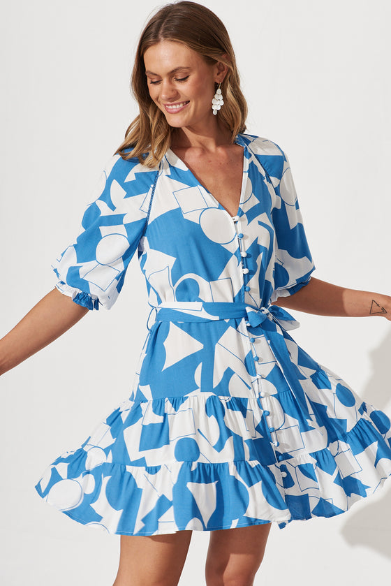 Love Ya Dress In Blue And White Geometric Print