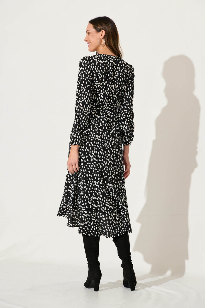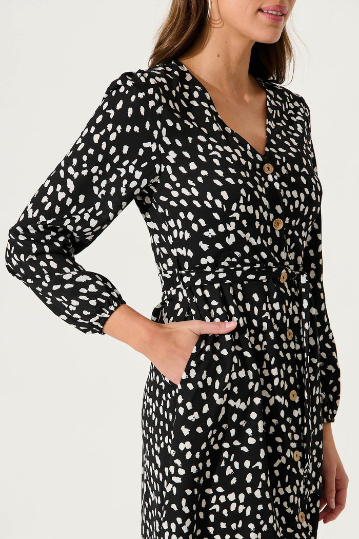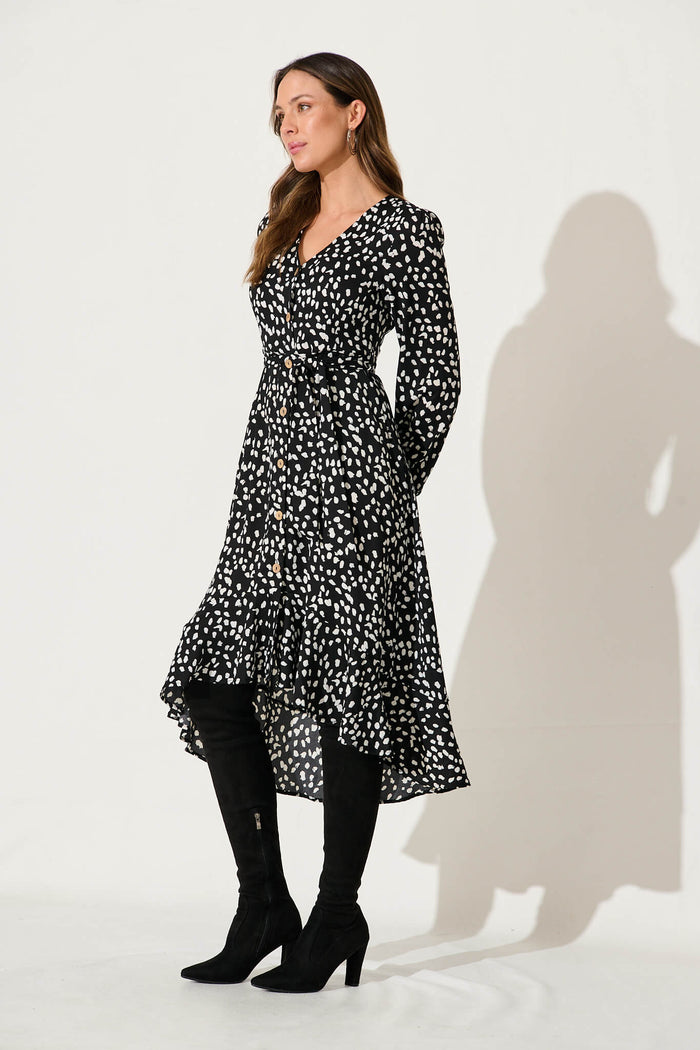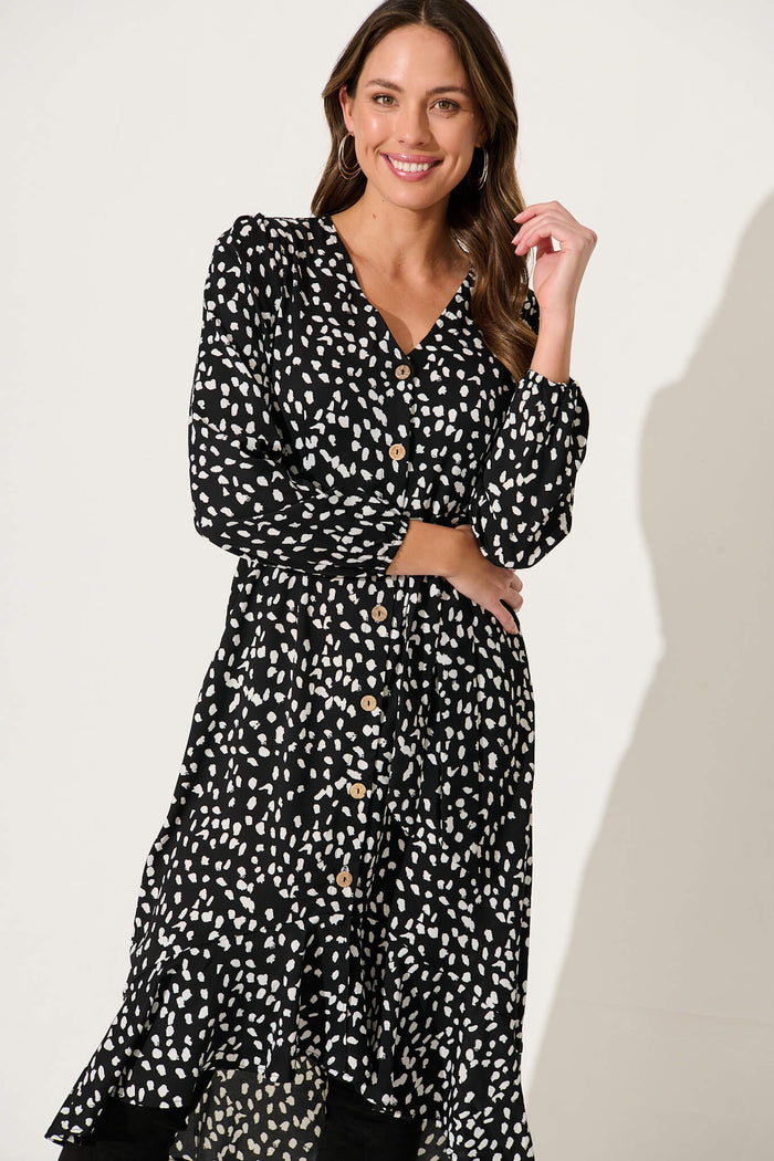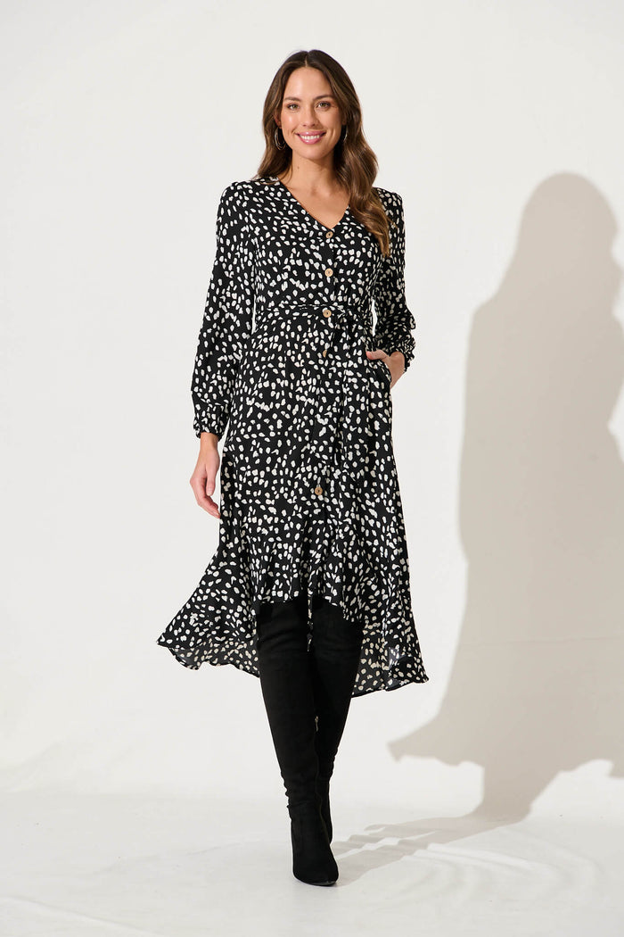 Go from work to wines with ease in the Mabo Midi Dress in Navy with Rust Leaf! This high low button through dress features a cinching waist tie and flared hem. Pair yours with simple nude heels and accessories!