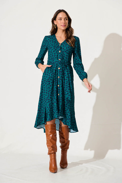 Mabo Midi Dress In Teal With Navy Leaf