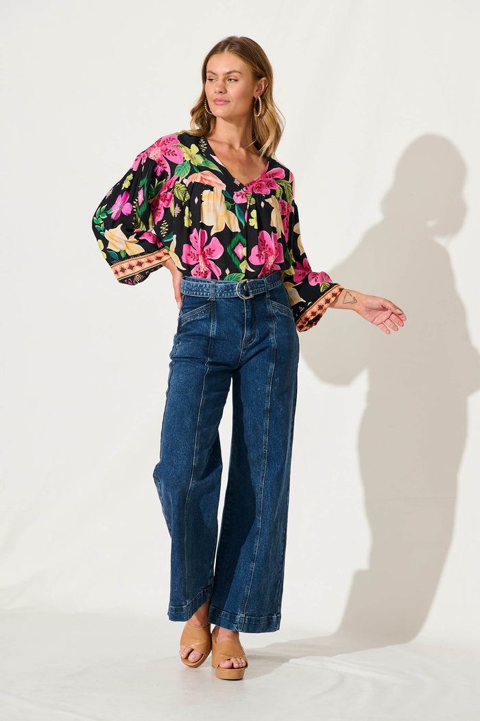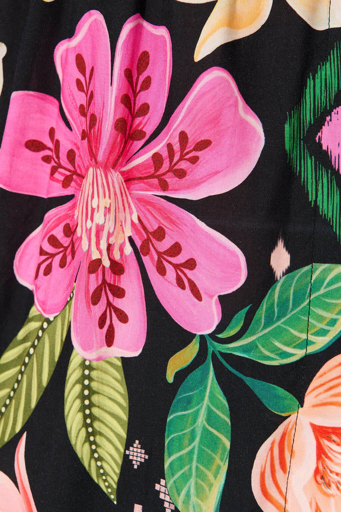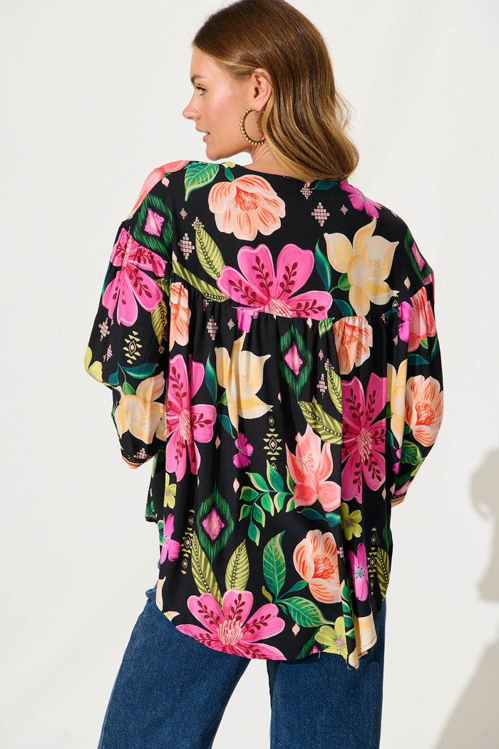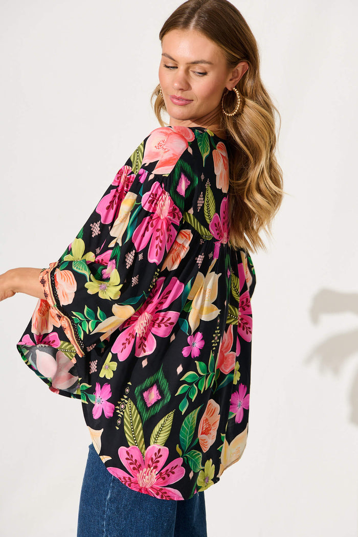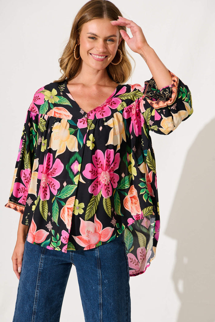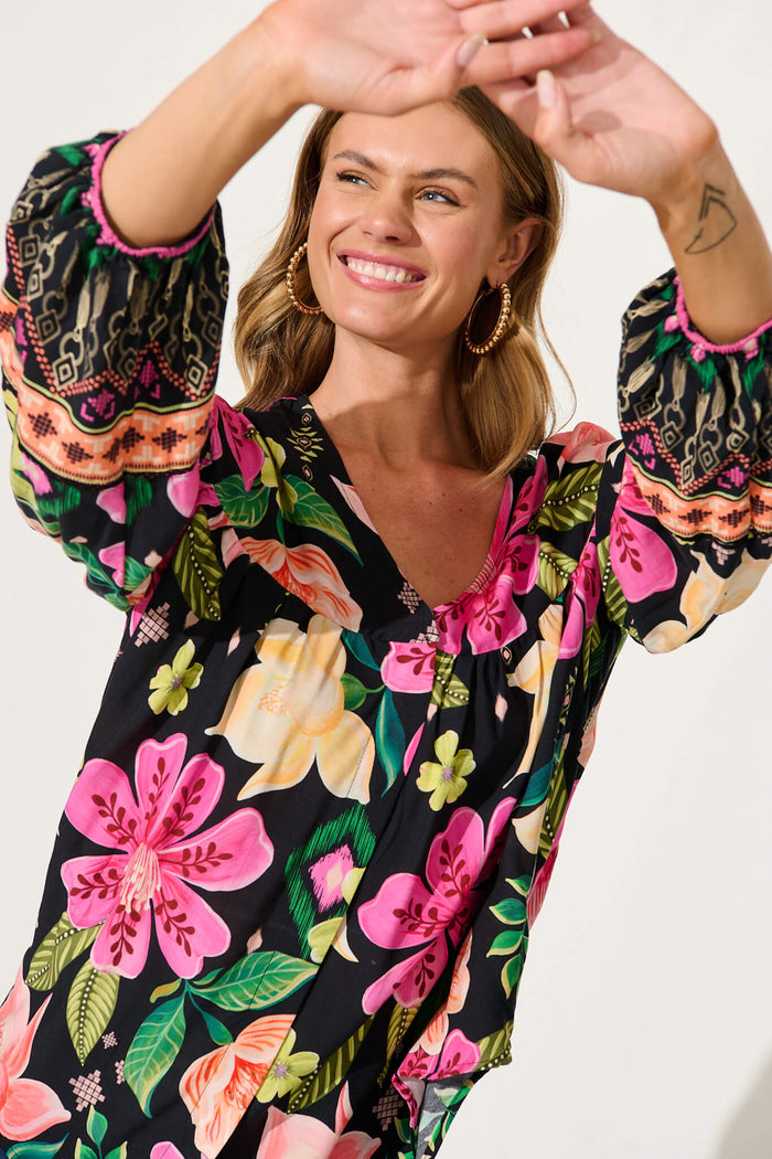 Magic Moment Top In Black With Bright Multi Floral