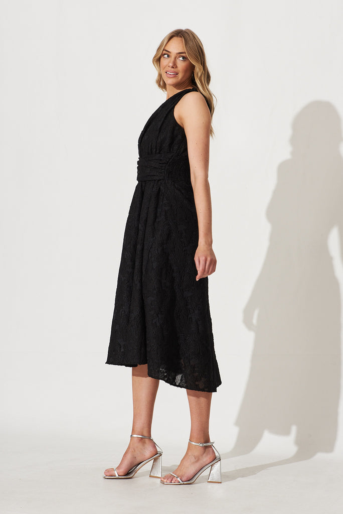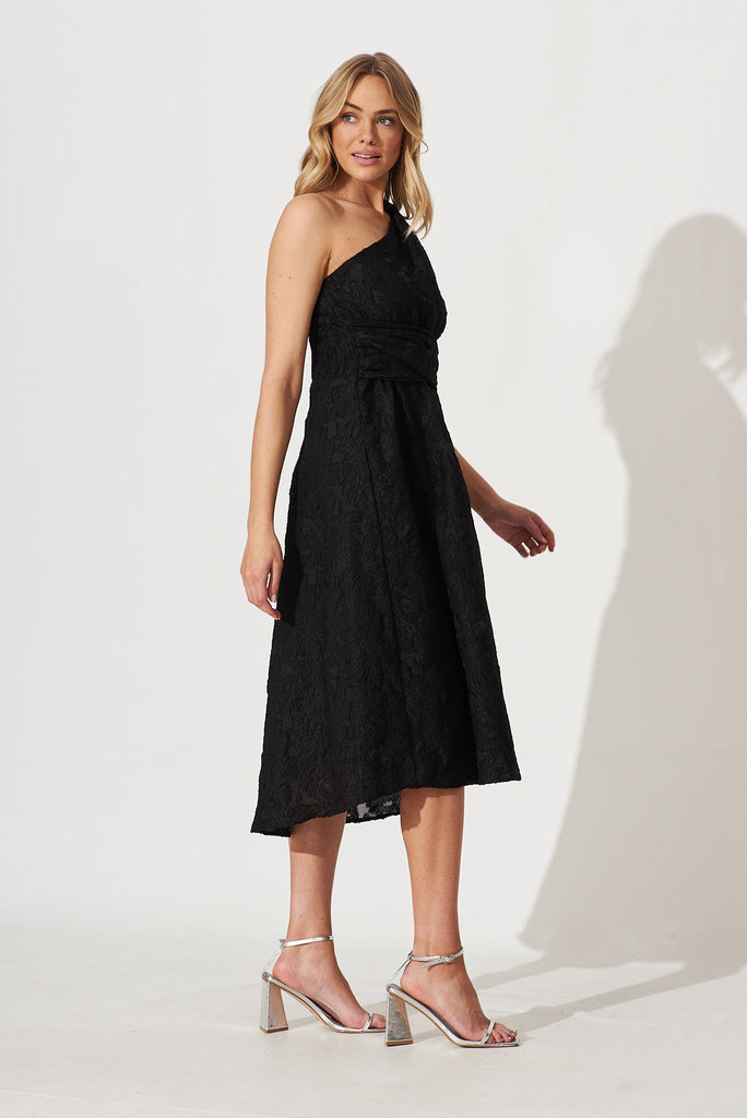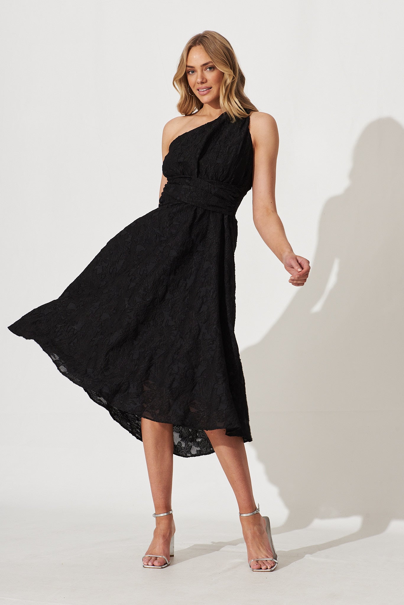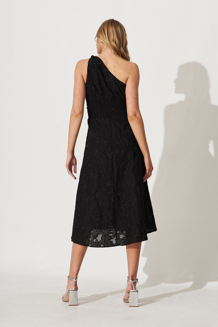 Majestic One Shoulder Midi Dress In Black Organza Burnout