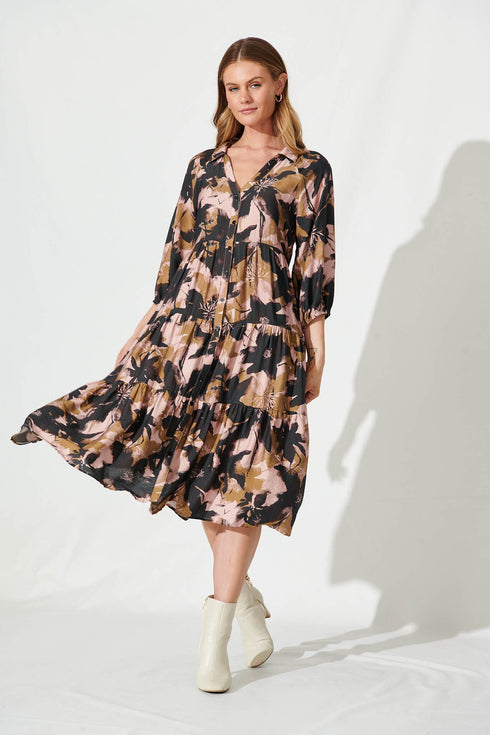 Marcella Midi Shirt Dress In Black Multi Print Cotton Blend