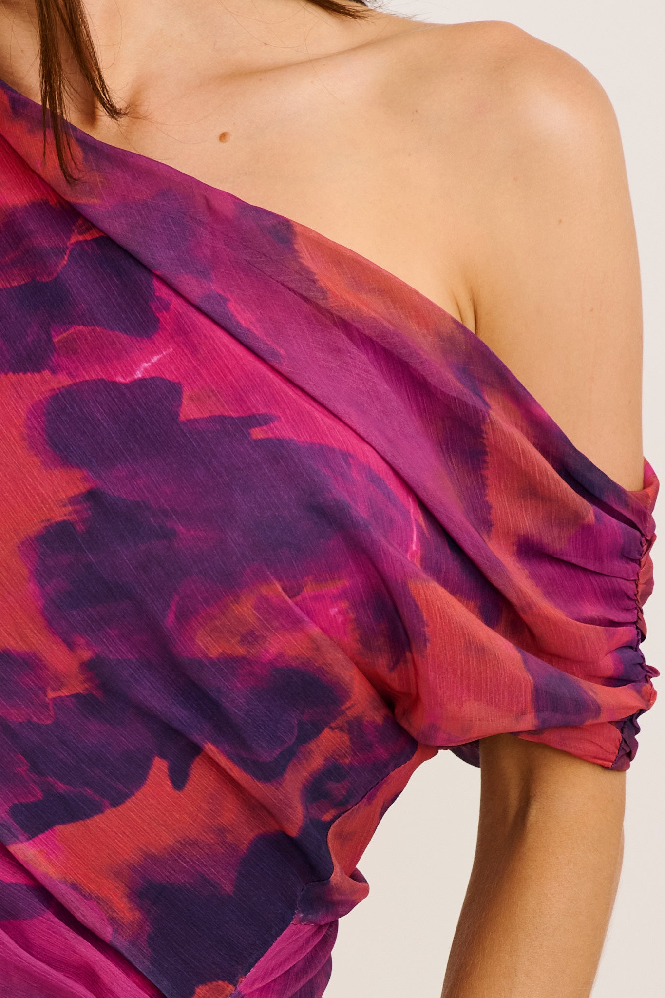 Designed in a lightweight chiffon with a smooth feel, this non-stretch style drapes beautifully over the body. The off-shoulder neckline elegantly frames your collarbones, while delicate ruching across the front and side waist adds flattering dimension. A fully lined finish keeps things polished, while the invisible side zipper and elastic waist provide subtle structure and shape.