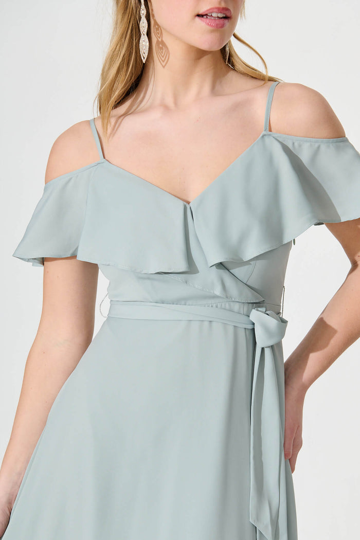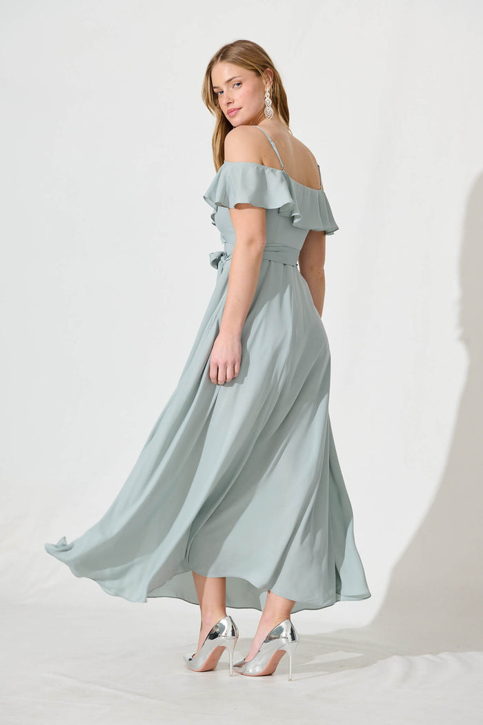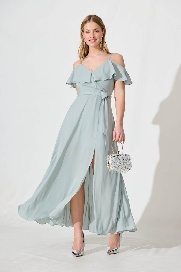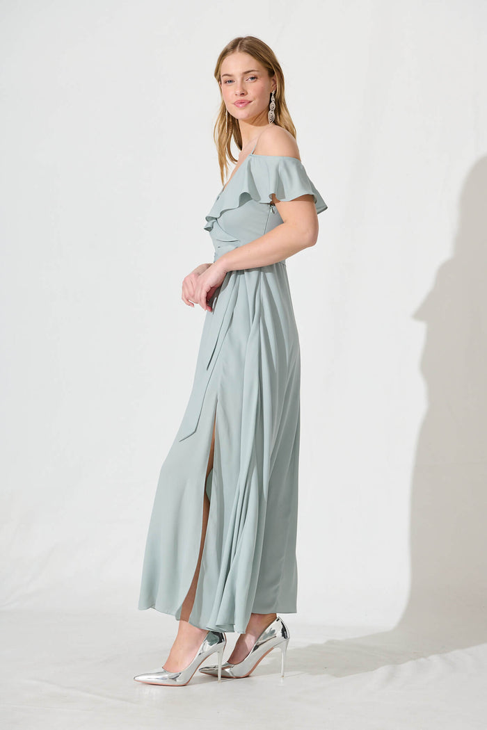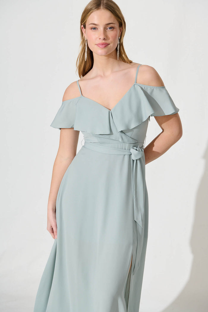 Bring a fresh, romantic energy to your next special event with the Marit Maxi Dress in Sage, a modern favourite for bridesmaids and wedding guests alike. This floaty dress features a ruffled V-neckline, soft off-shoulder sleeves, and a delicate adjustable shoulder strap for comfort and support. The tailored bodice and waist tie flatter every silhouette, while the relaxed maxi skirt and playful front split make every step picture-perfect.