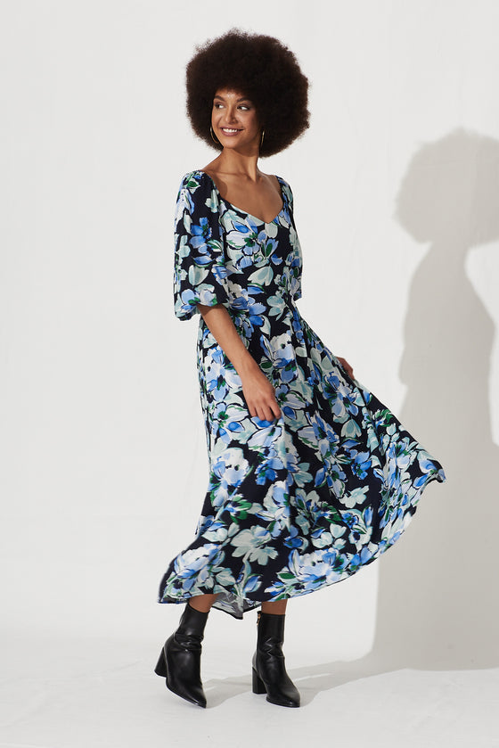 Marley Maxi Dress In Black With Multi Blue Floral Print