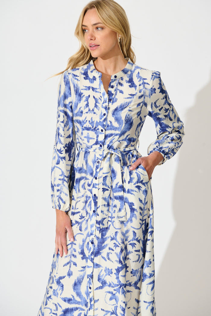 Marnie Midi Dress in White and Blue Print
