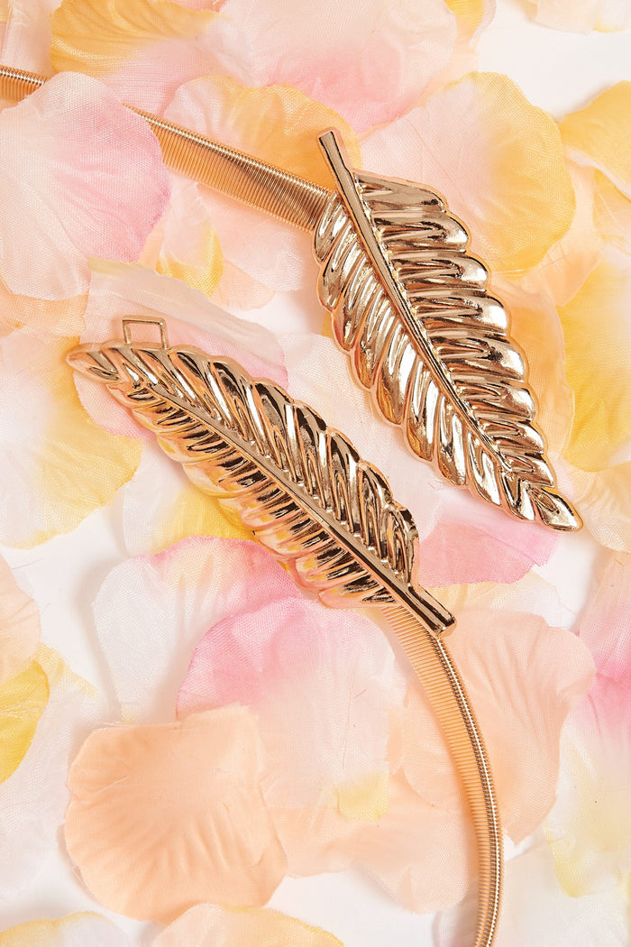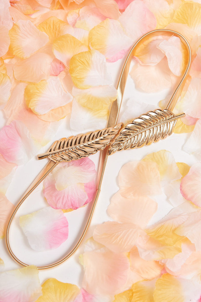 Our August + Delilah Melissa Leaf Stretch Belt in Gold is the perfect finish touch to upgrade every outfit. This elegant piece is perfect to wear on a dress, skirt, jumpsuit, pants or tunic.