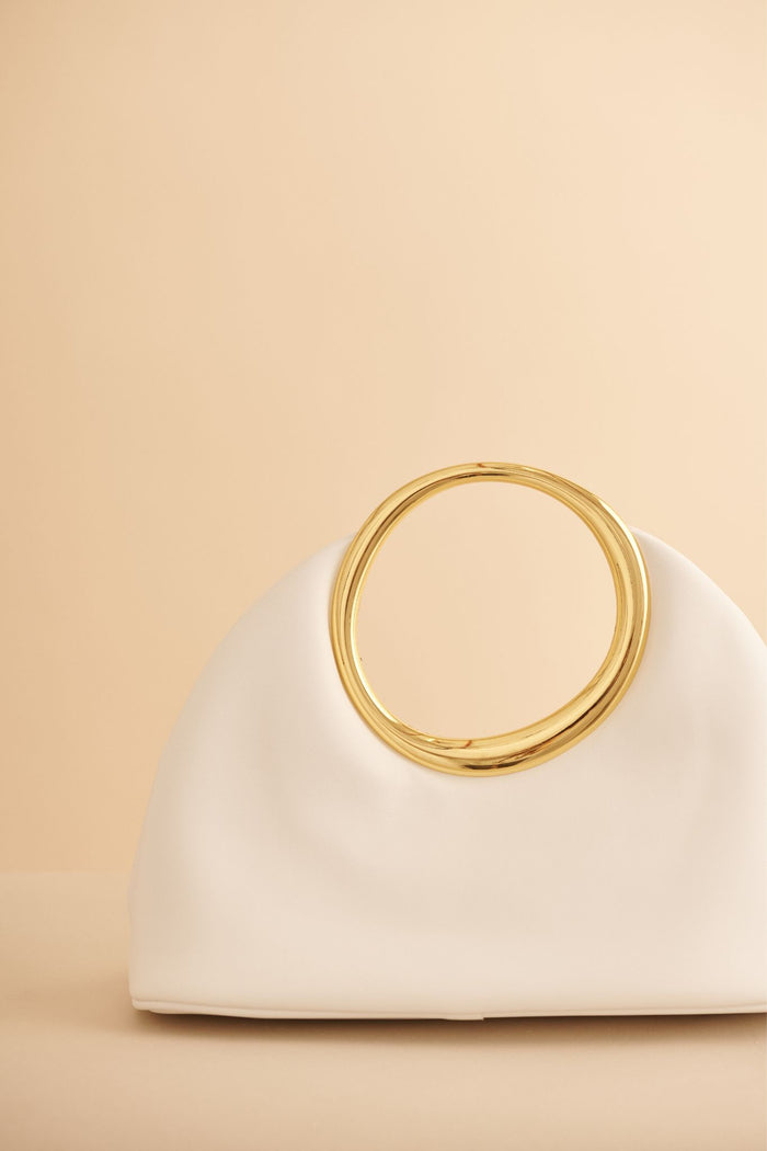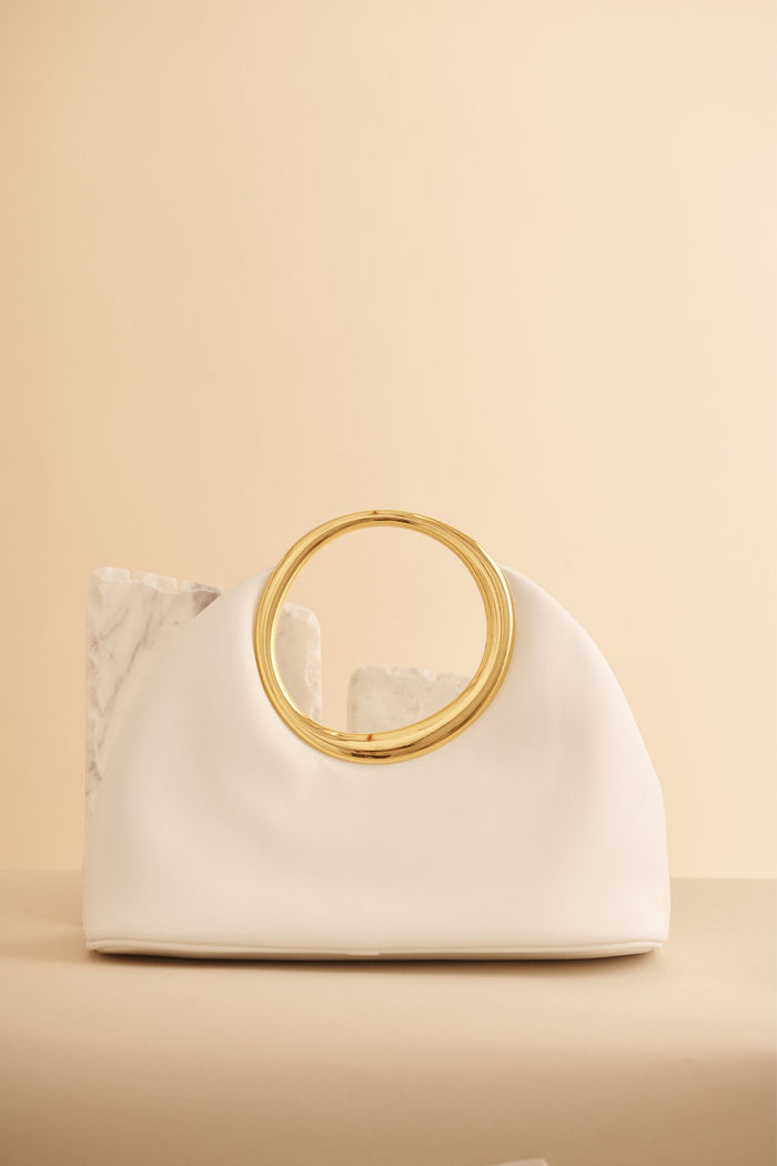 Add a touch of polish to your party look with the Milly Ring Detail Clutch Bag in White. Sleek, structured and perfectly sized for your event essentials, this versatile accessory is ideal for weddings, nights out or special celebrations. Featuring a fixed handle with gold ring detail and a magnetic closure, it's finished with a fully lined interior to keep your must-haves secure and stylish.