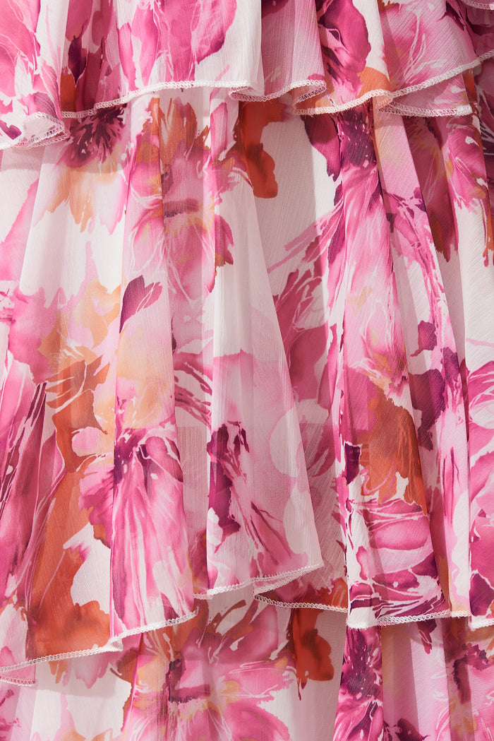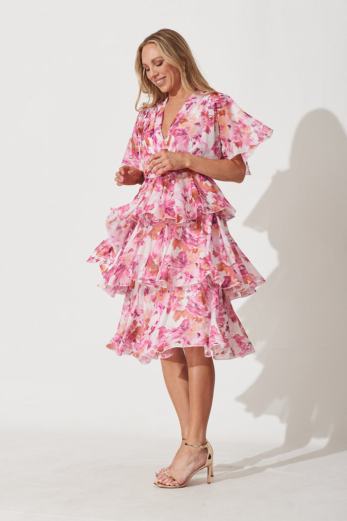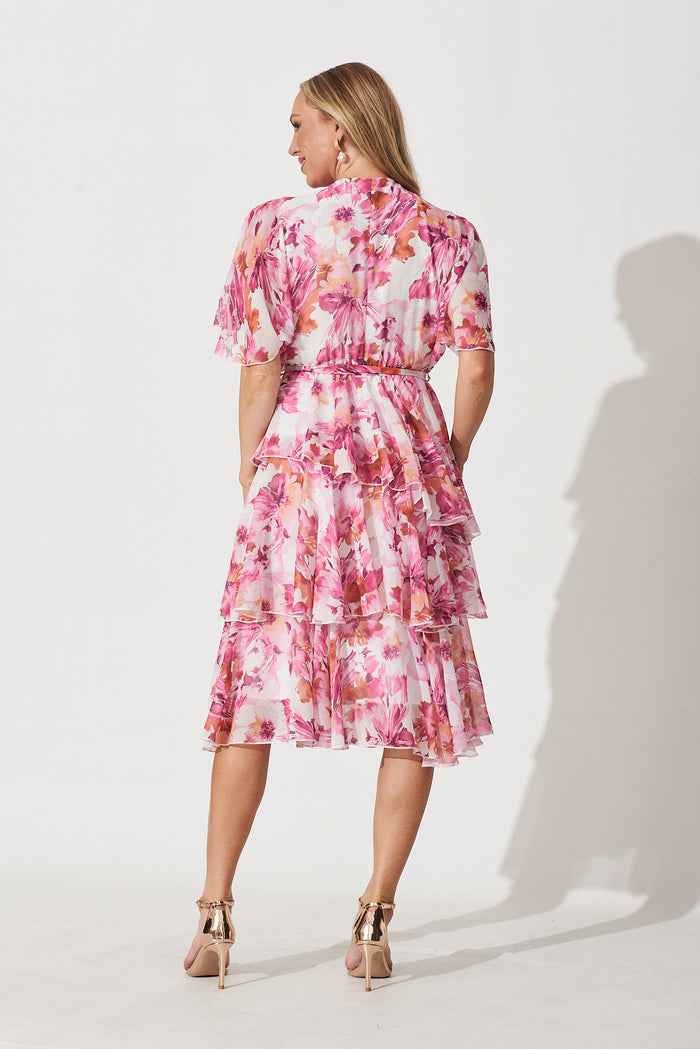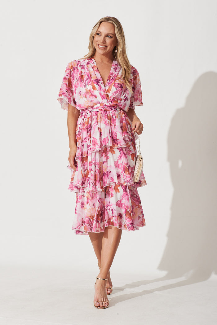 Mindy Midi Dress In White With Pink And Purple Floral Chiffon