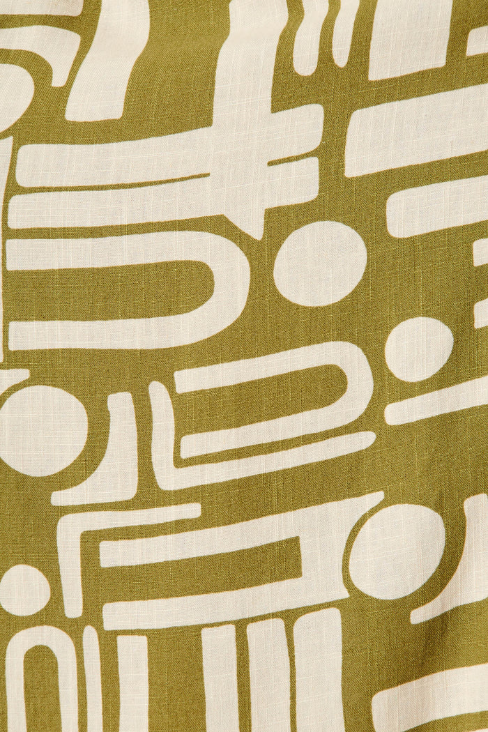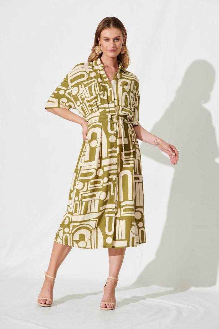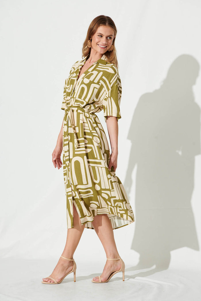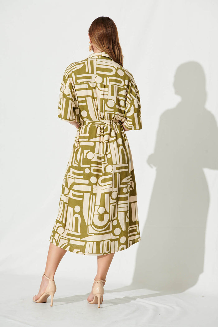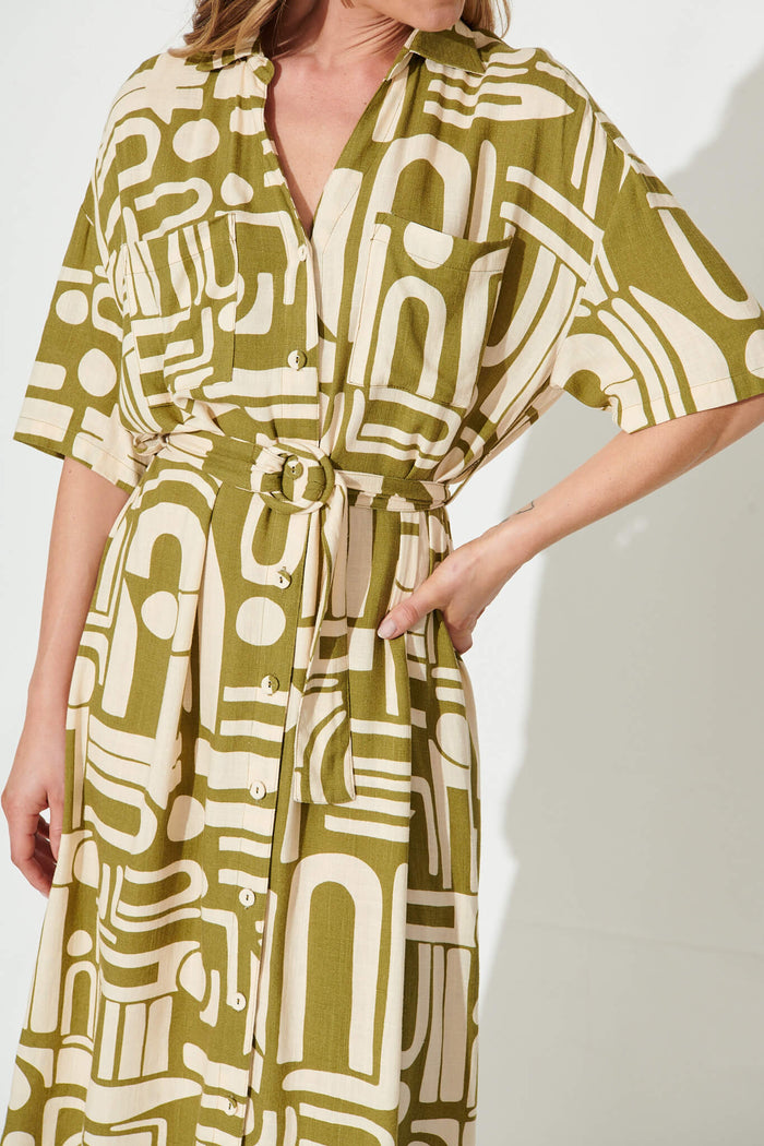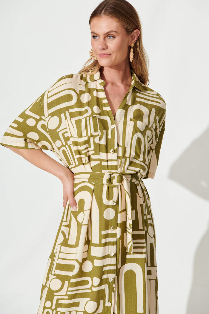 Miriam Maxi Shirt Dress In Cream And Olive Abstract Linen Blend