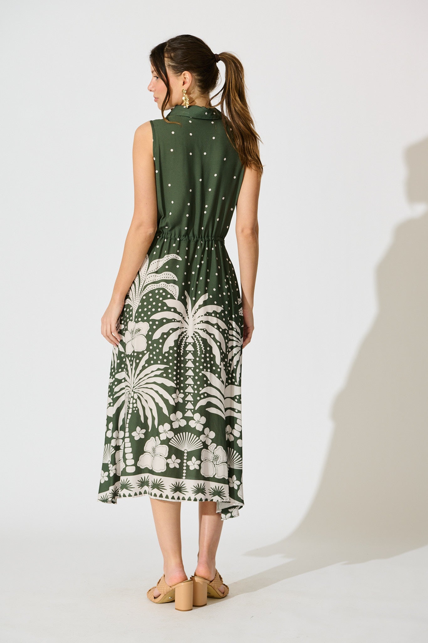 The Mirren Midi Dress in Emerald with White Palm Print captures the essence of relaxed summer dressing. With a flattering midi cut and waist-cinching drawstring, it’s as practical as it is pretty.