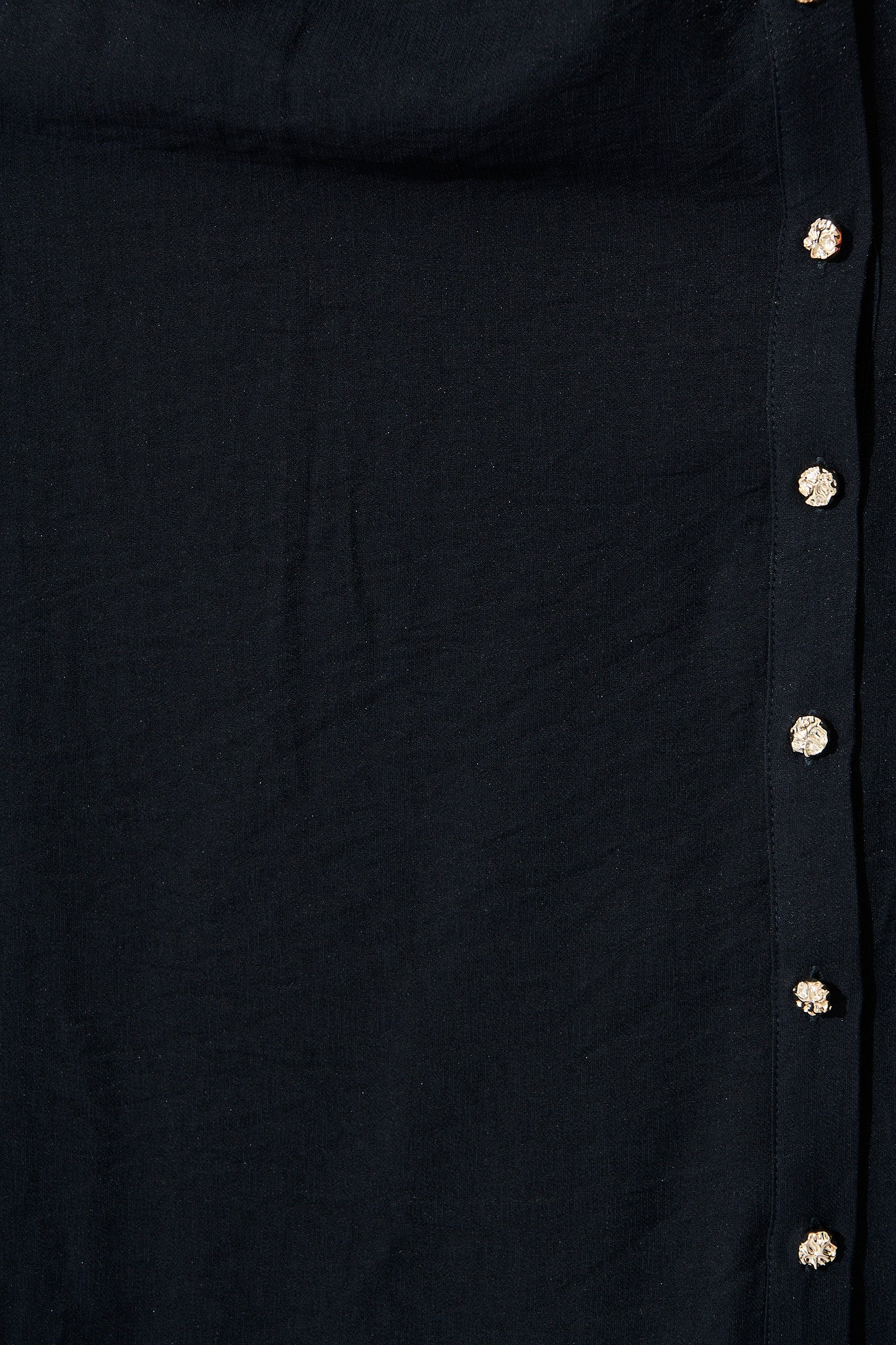 - Functional sleeve cuffs with textured gold button and sleeve tab