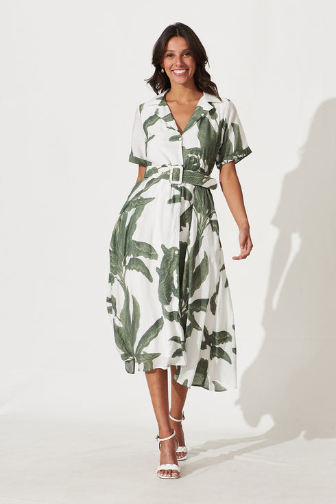 My Sweet Midi Shirt Dress In White With Green Leaf Print