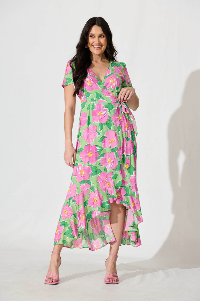 Naira Midi Wrap Dress in Green and Purple Floral