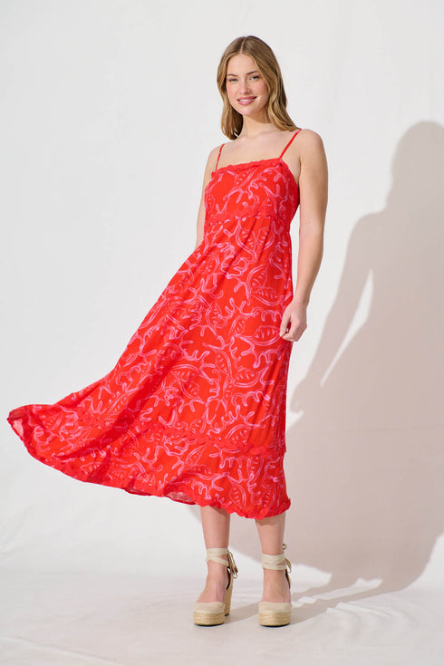 Nightbloom Maxi Sundress In Red Print With Ric Rac Trim