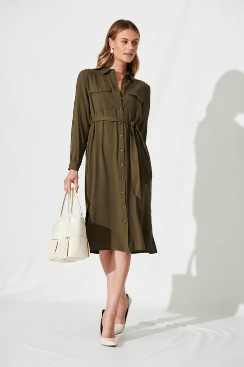 Nirvani Midi Shirt Dress In Khaki