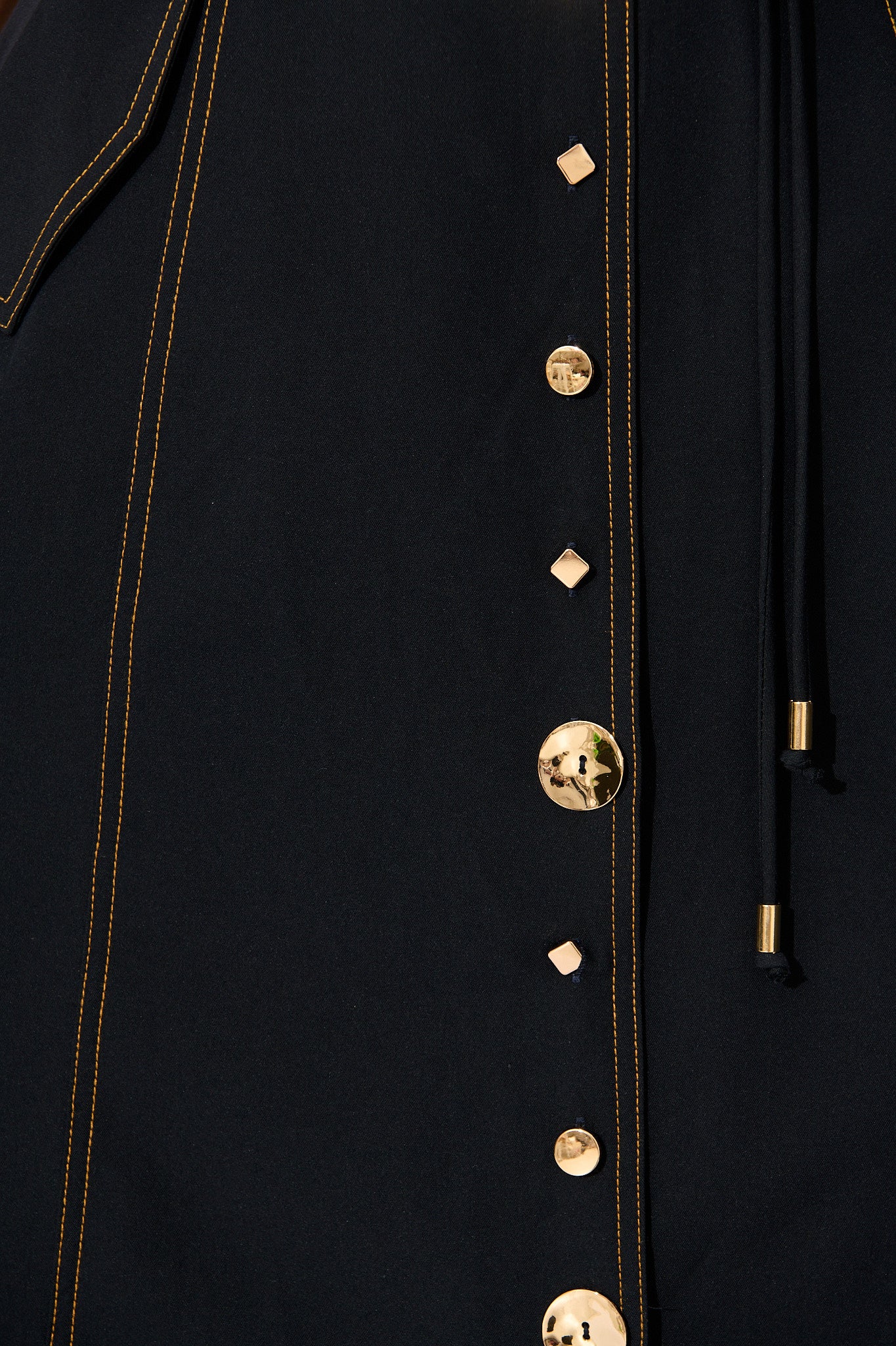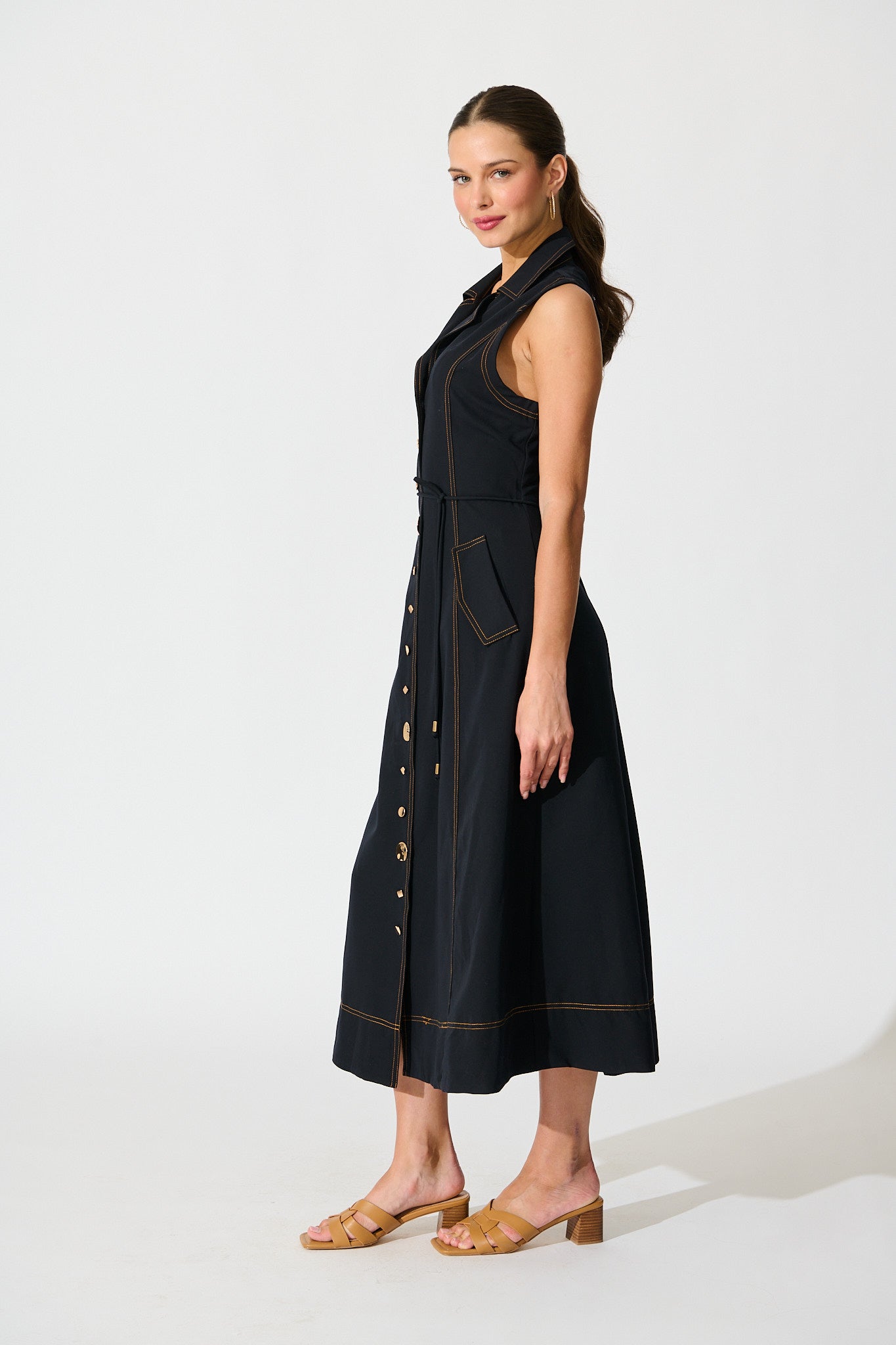 Crafted from a lightweight, breathable stretch fabric, it features a viscose–polyester blend with just enough give to flatter your shape without clinging. The sleeveless cut and princess seam detail offer a clean silhouette, while gold buttons and contrast stitching add subtle elevated touches. A self-tie belt with gold toggles cinches the waist, and practical side pockets make it as functional as it is chic.