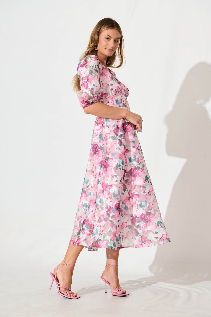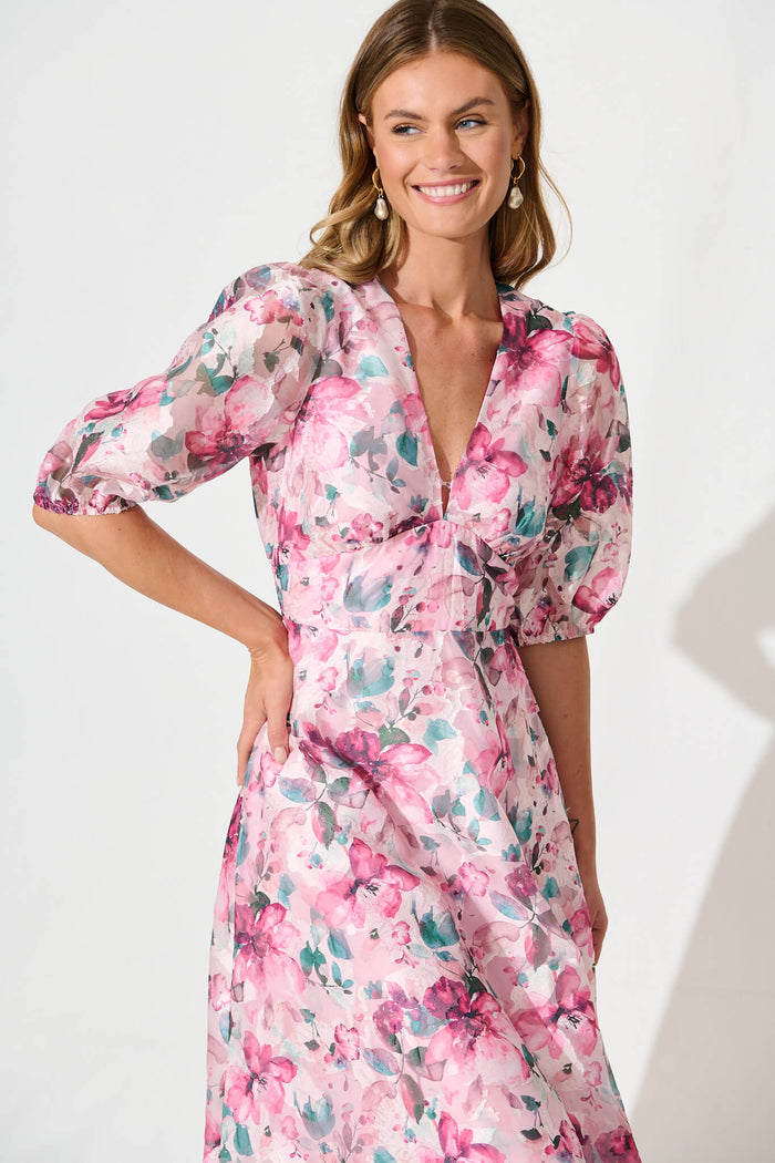 Opulence Midi Dress in Multi Pink Floral Organza