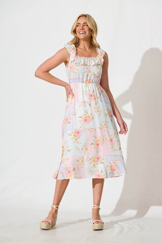 Paige Midi Dress In Pastel Floral Patchwork Linen Blend