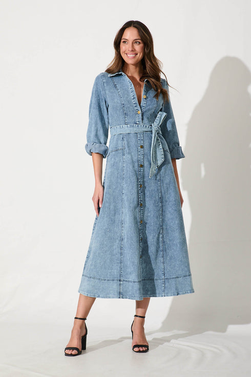 Palma Maxi Shirt Dress In Blue Wash Stretch Denim