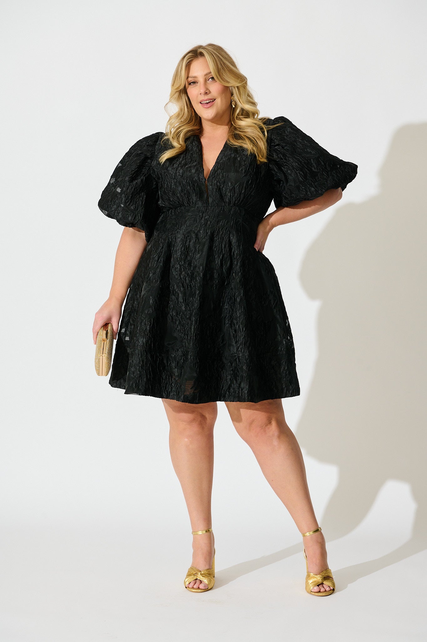 It features a flattering V-neckline with a subtle silver hook front and softly puffed sleeves that sit comfortably with encased elastic. The box pleat front creates graceful structure, while the shirred back offers added flexibility and comfort. Fully lined for ease and confidence, this dress is lightweight yet impactful — perfect for weddings, cocktail events or formal dinners.