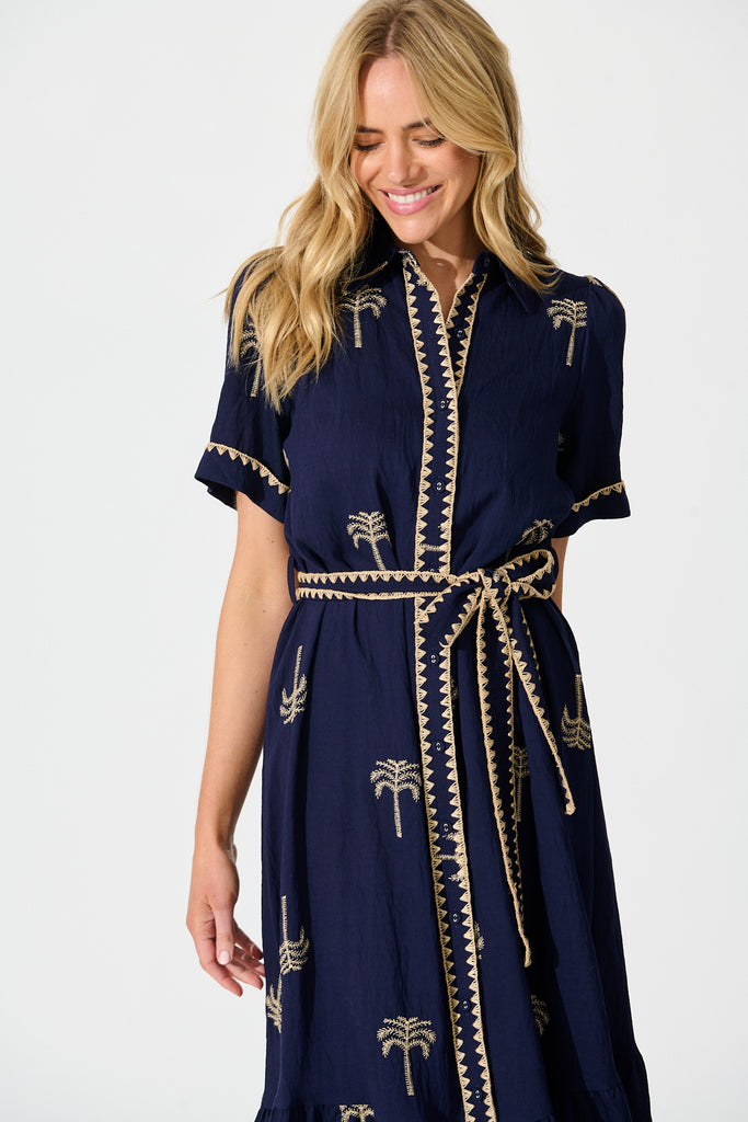 Parker Midi Shirt Dress in Navy with Palm Embroidery